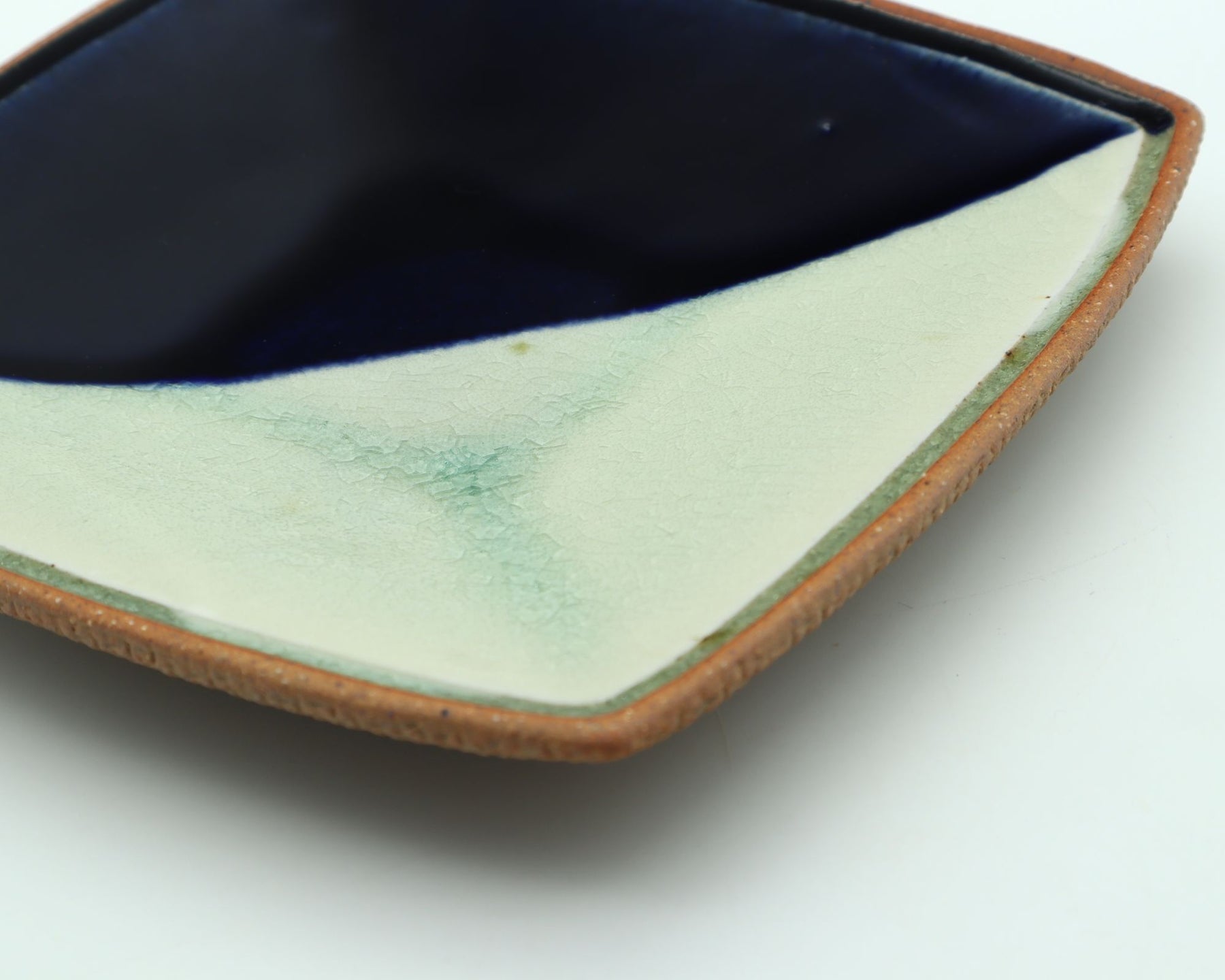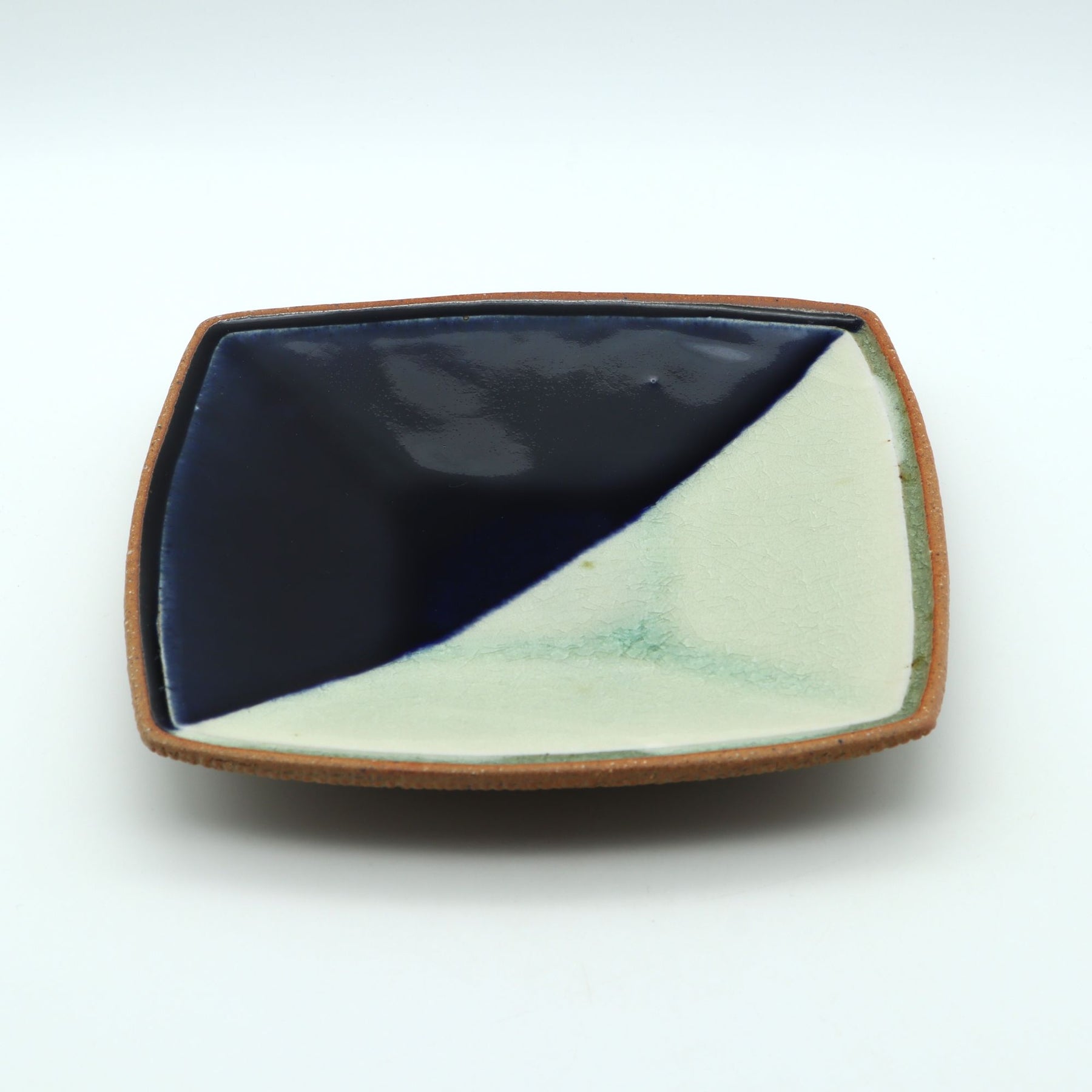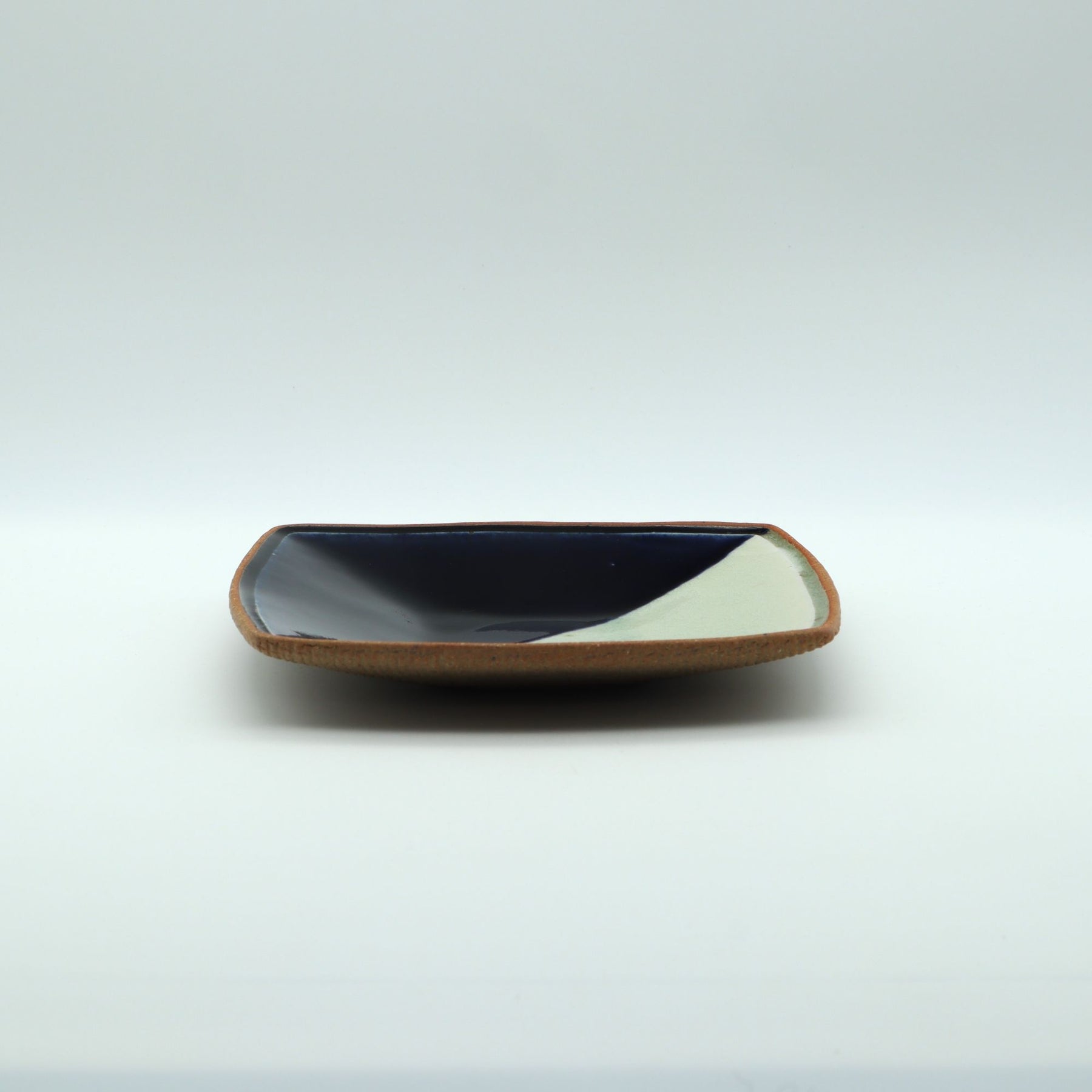 こちらは異なる釉薬による2色使いが魅力の角皿。対角線で色分けしており、普段のお料理がモダンな印象にグレードアップ。中央に向かってやや傾斜しており、ソースやタレなど多少の汁気も大丈夫。サラダやカルパッチョ、巻き寿司、おにぎり、サンドイッチ、取り皿など幅広くお使いいただけます。