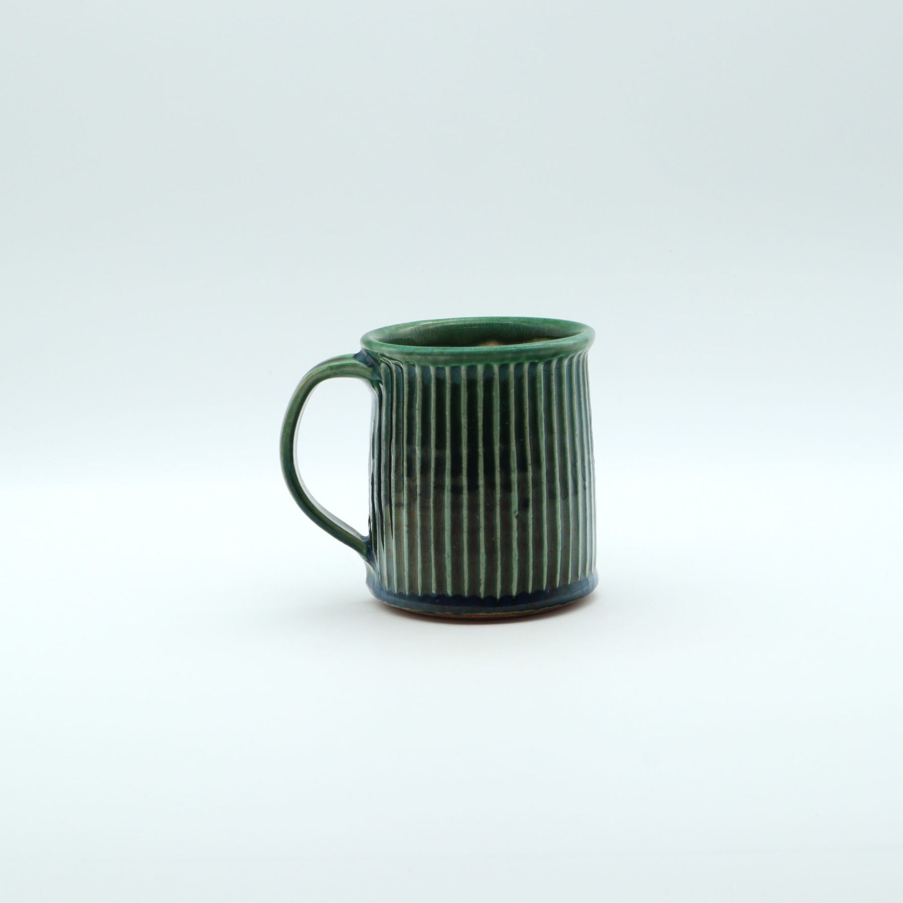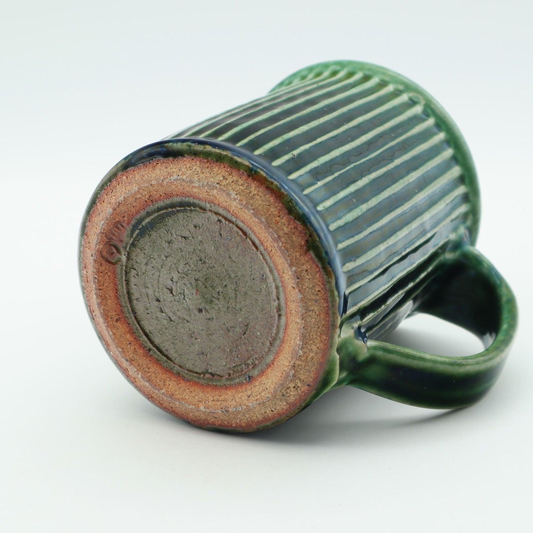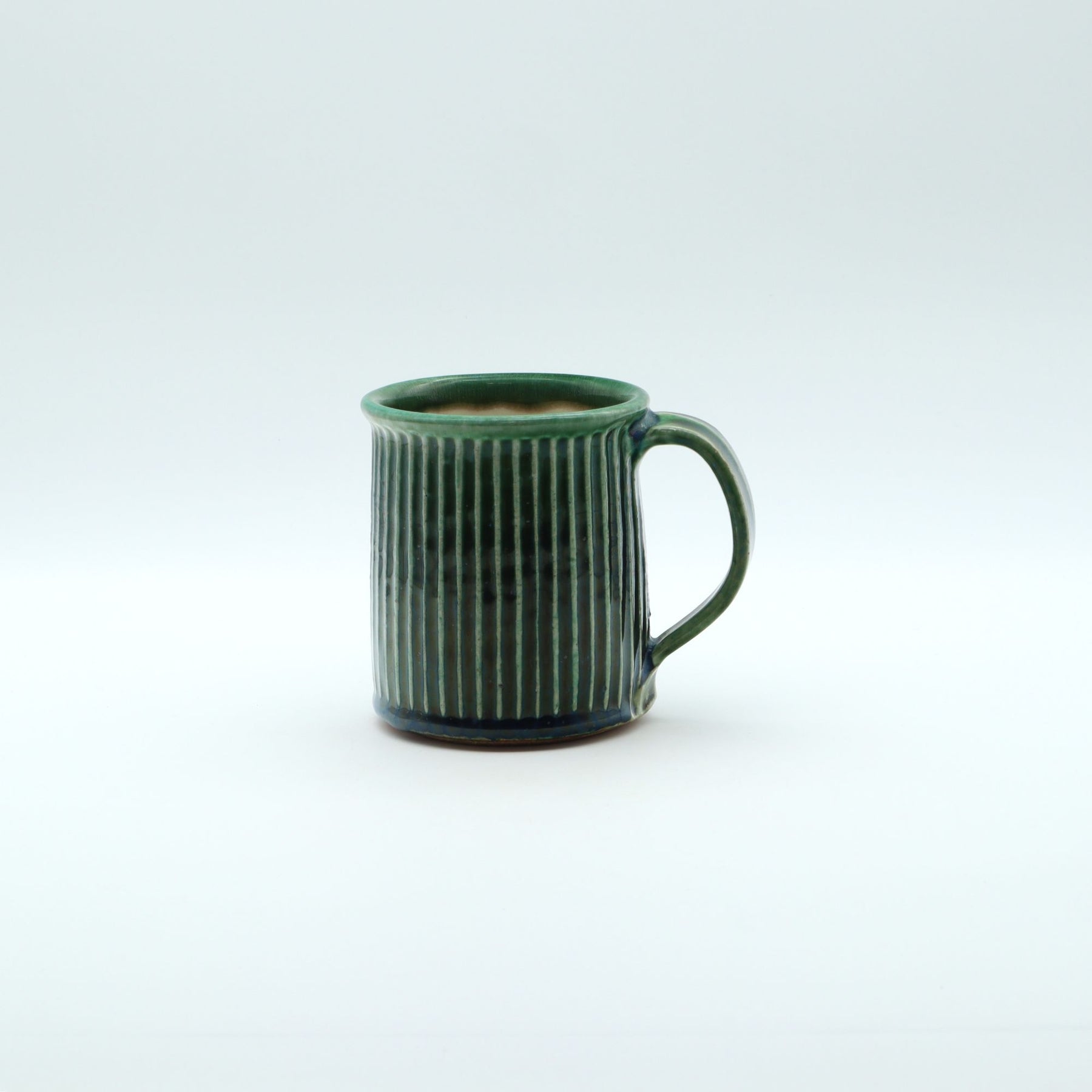 こちらは切立の鎬マグカップ。鎬の筋状の紋様によってできる凹凸に釉薬がかかることで濃淡が生まれ、器に深みと奥行きをもたらしてくれます。スタイリッシュなフォルムで、朝の一杯、日中のコーヒータイム、夜のリラックス時の一服など日常使いにぴったりのサイズ感。底面にある円を描いたような凹凸は、デザイン性のほかに少しでも軽くして使いやすくしたいという作家さんの想いから。見えないところにもこだわりが詰まった一品です。