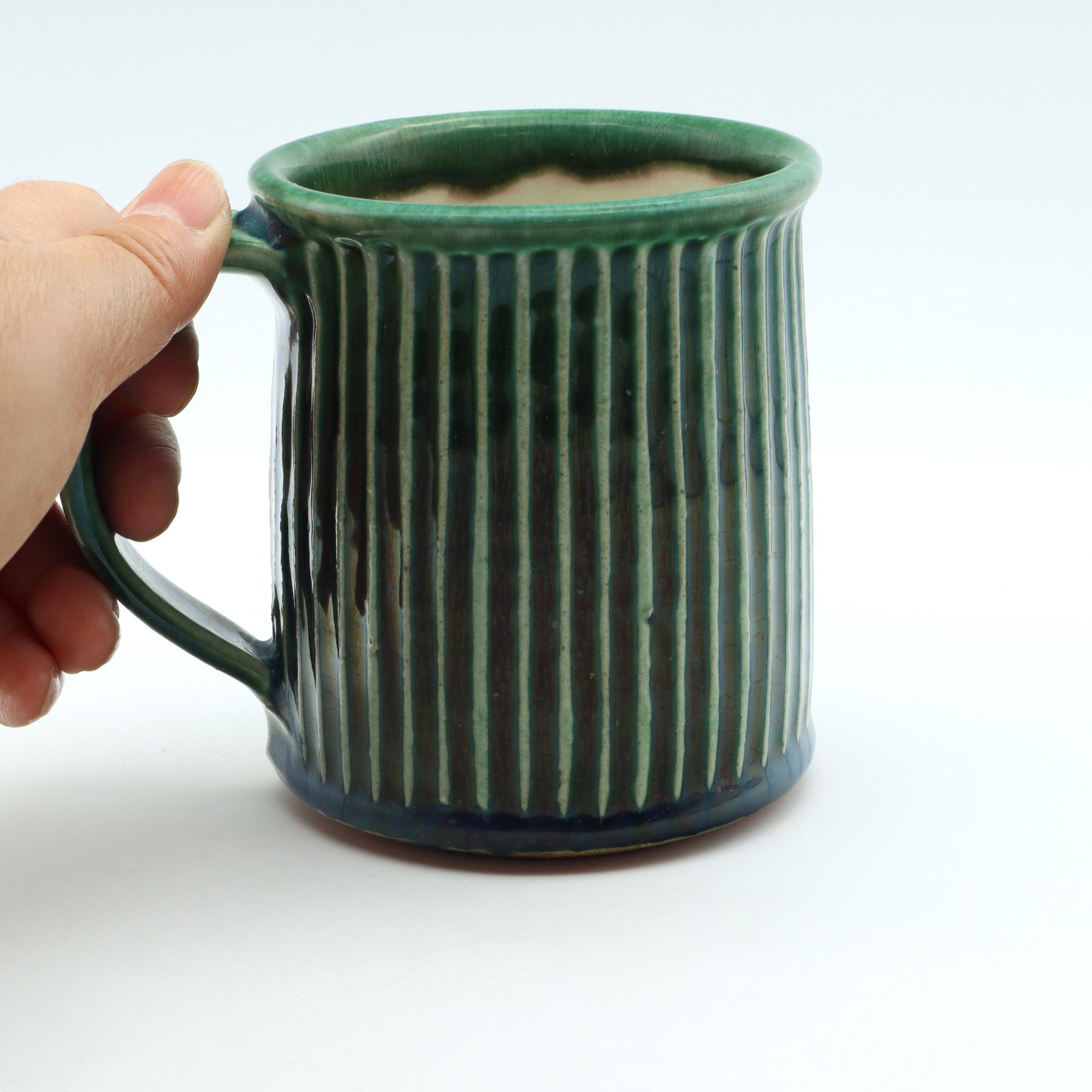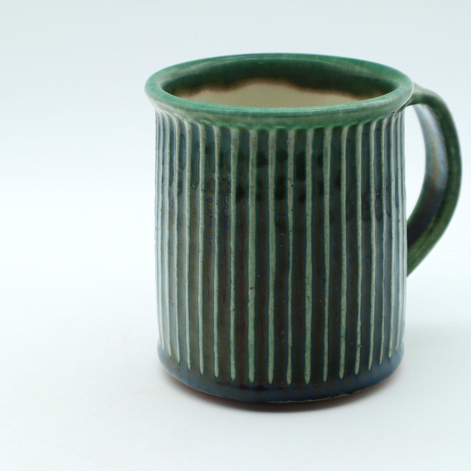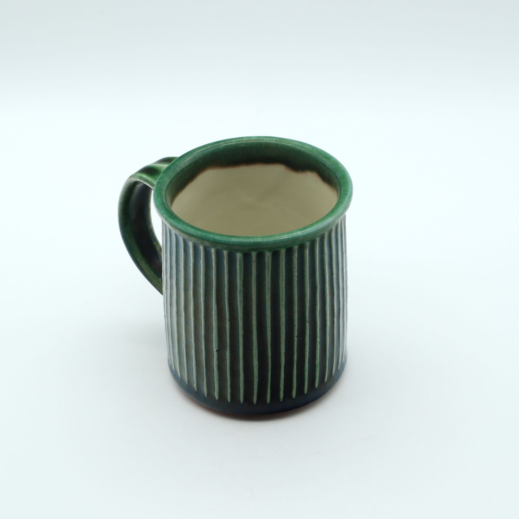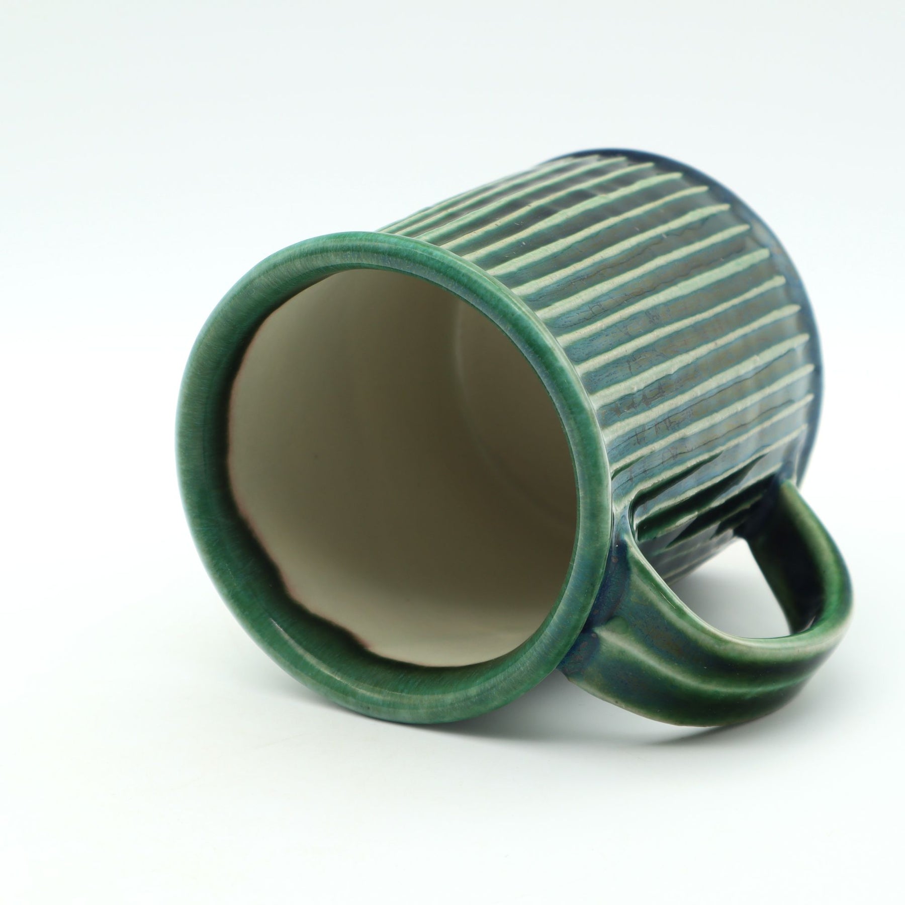 こちらは切立の鎬マグカップ。鎬の筋状の紋様によってできる凹凸に釉薬がかかることで濃淡が生まれ、器に深みと奥行きをもたらしてくれます。スタイリッシュなフォルムで、朝の一杯、日中のコーヒータイム、夜のリラックス時の一服など日常使いにぴったりのサイズ感。底面にある円を描いたような凹凸は、デザイン性のほかに少しでも軽くして使いやすくしたいという作家さんの想いから。見えないところにもこだわりが詰まった一品です。