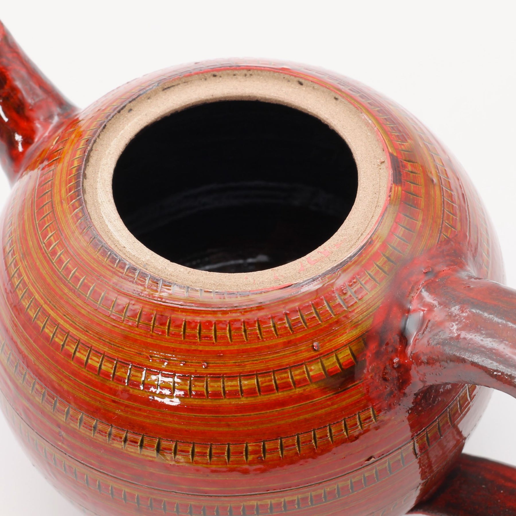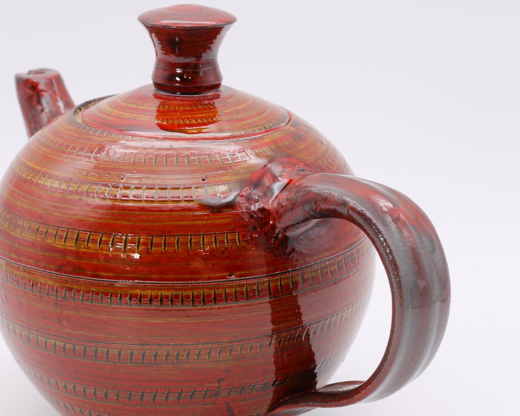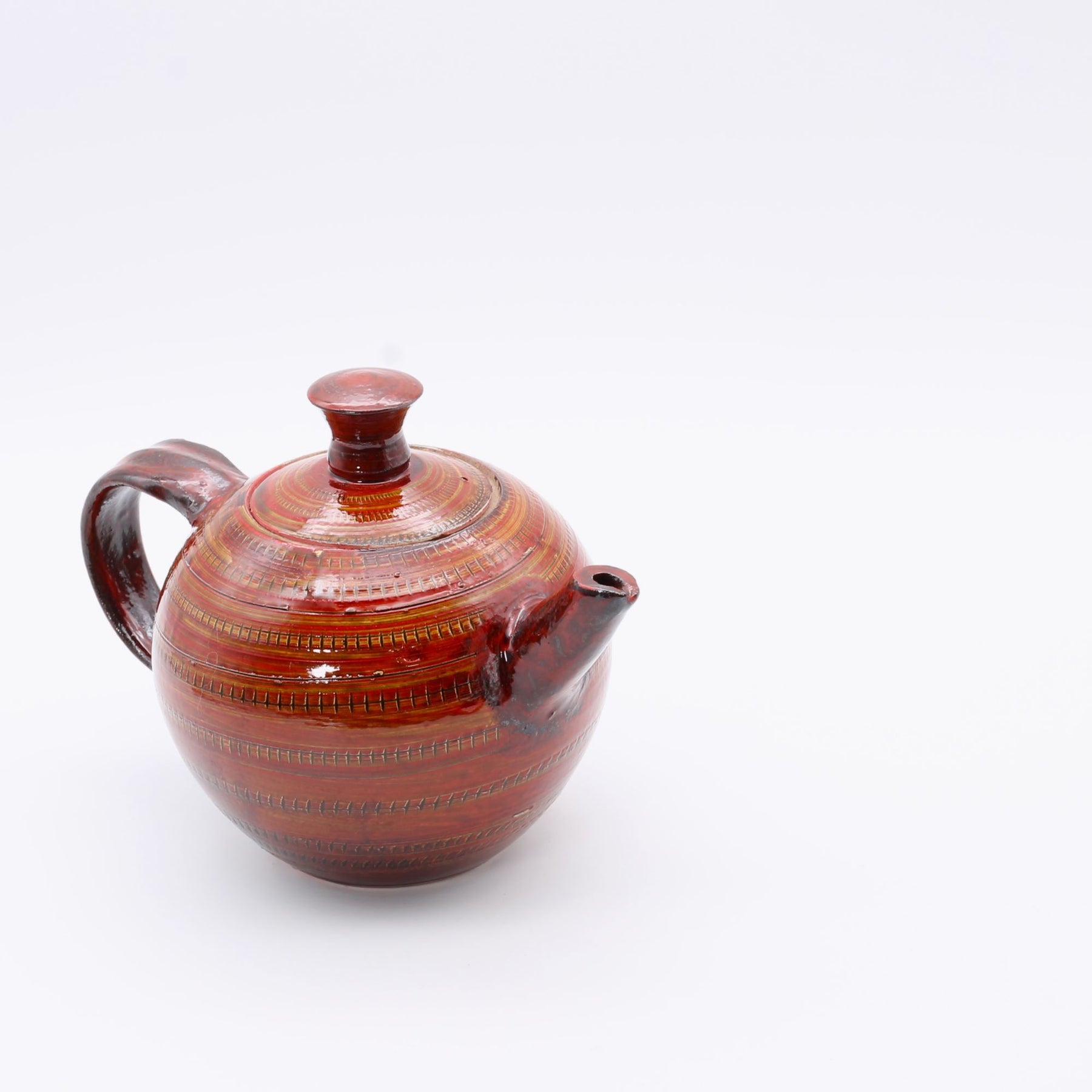 こちらはまん丸のフォルムが愛らしい急須。胴の周囲に施された飛びカンナと、赤と黄色の明るい配色がテーブルを華やかに彩ります。緑茶、紅茶、中国茶などいろんなティータイムが楽しめそうなポットです。