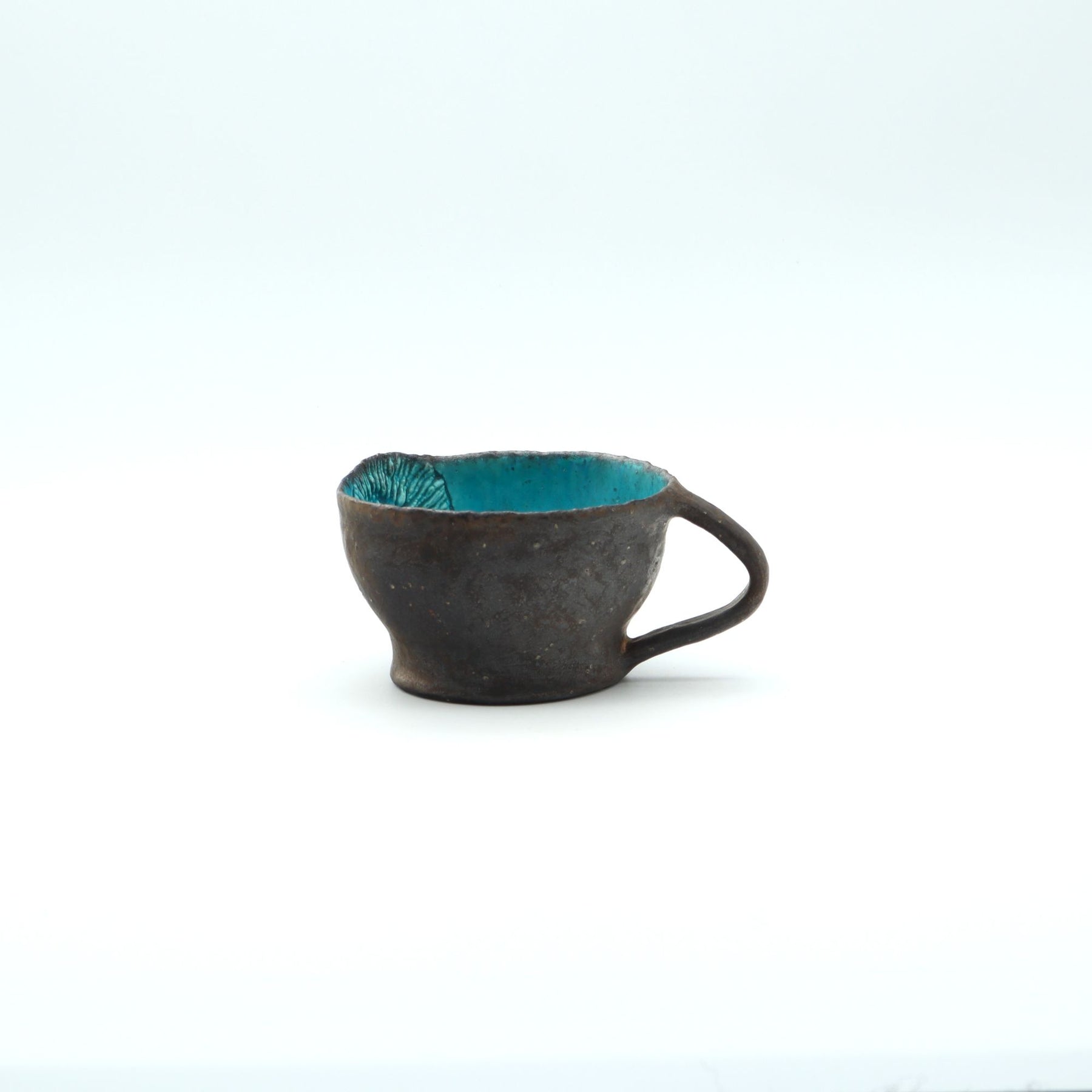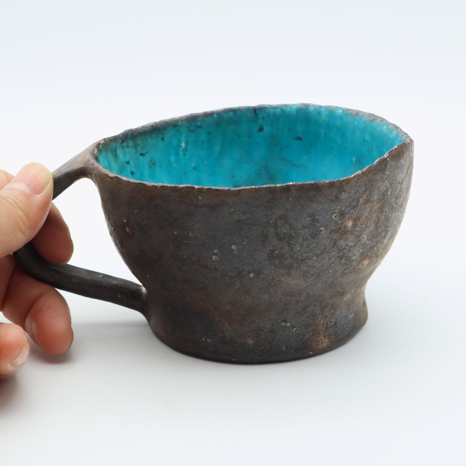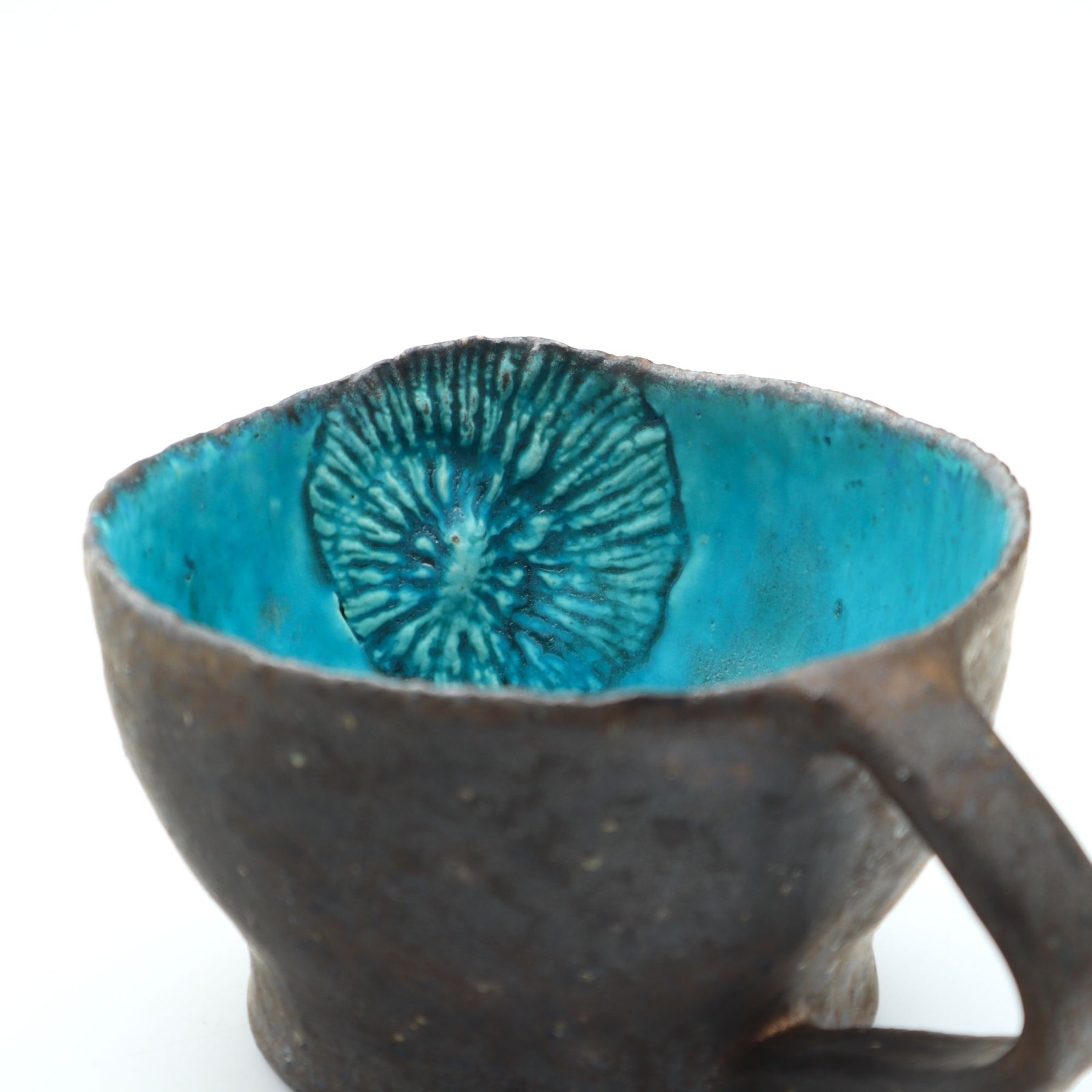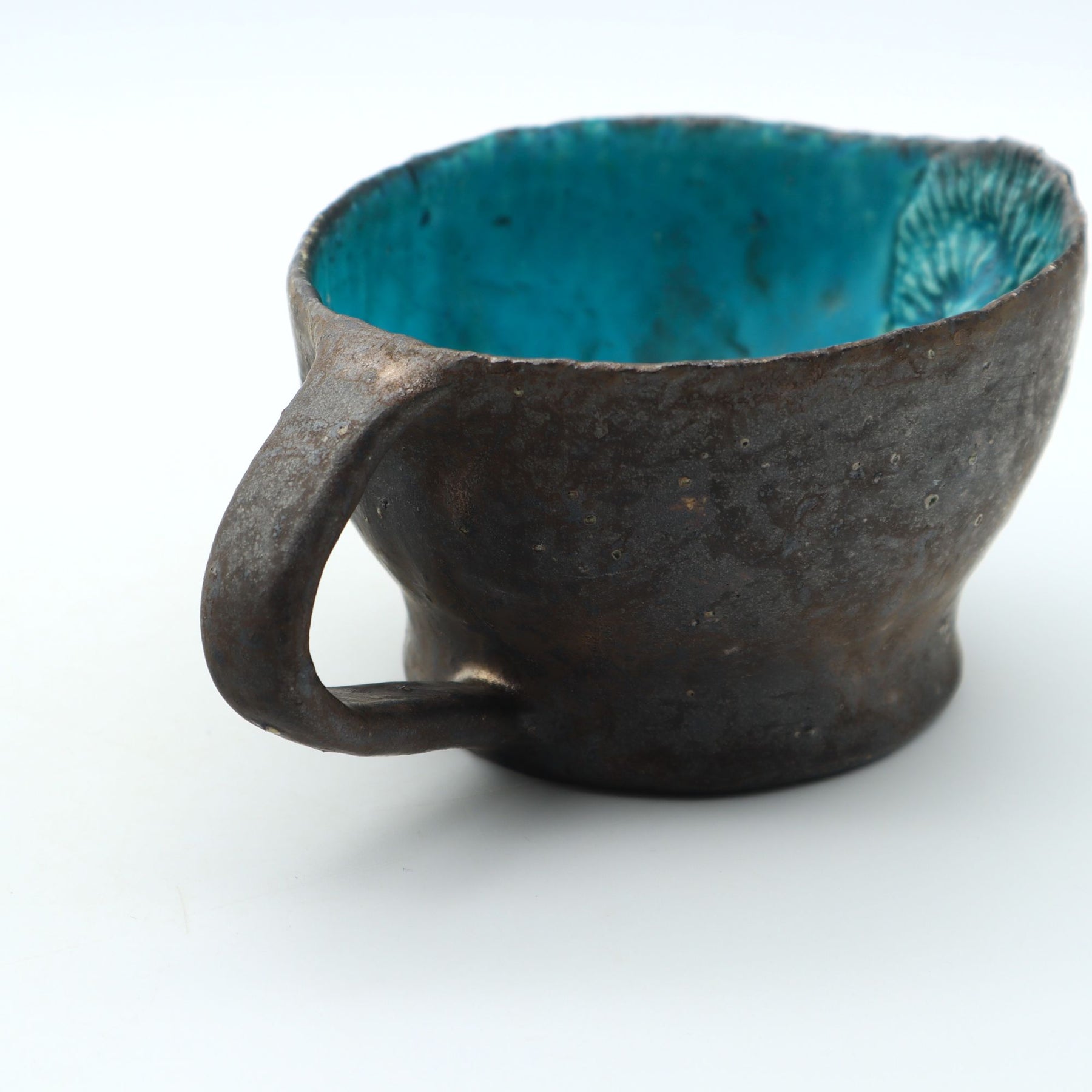 内側に施された凹凸の模様、青の釉薬の色味、ブロンズ色のハンドルやゆらぎのあるラインがアンティークな風合いを醸し出し、他にはない魅力的ななカップになっています。