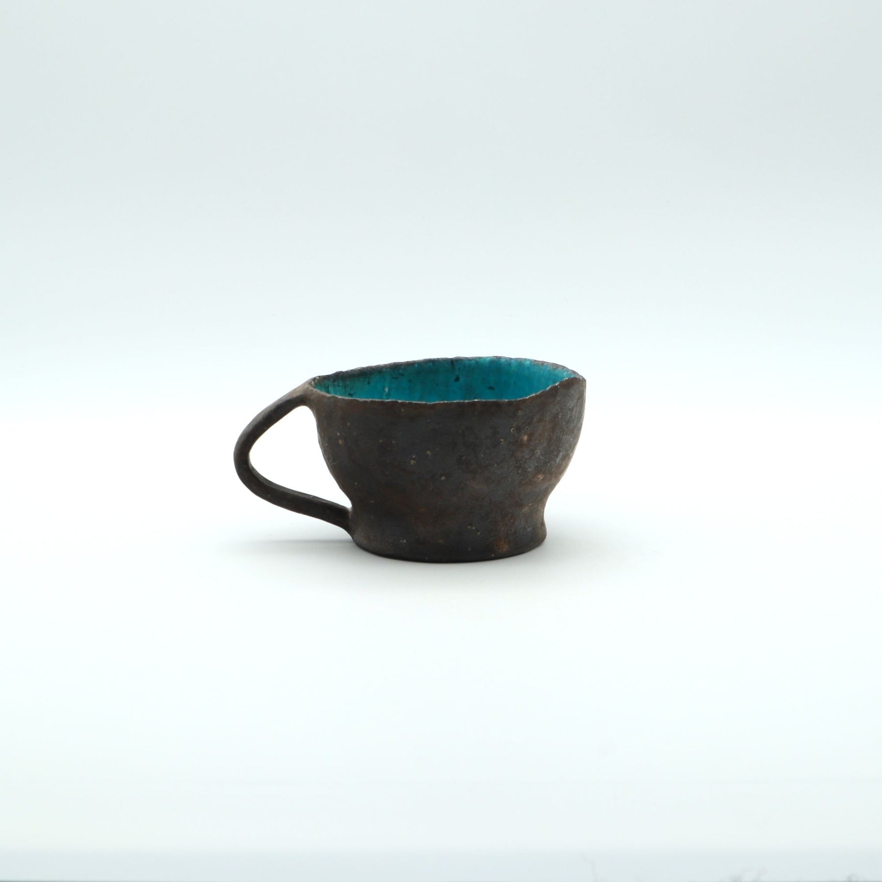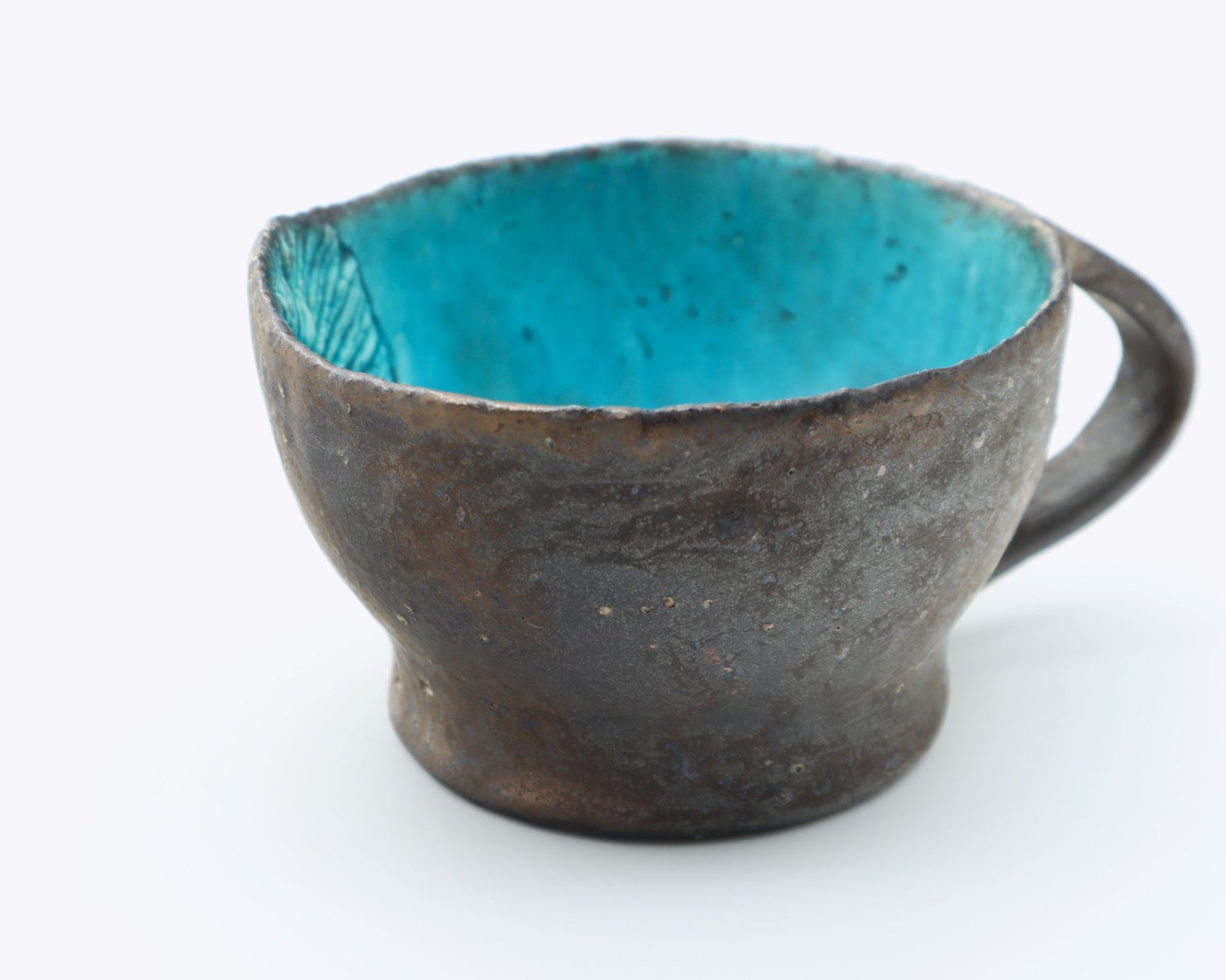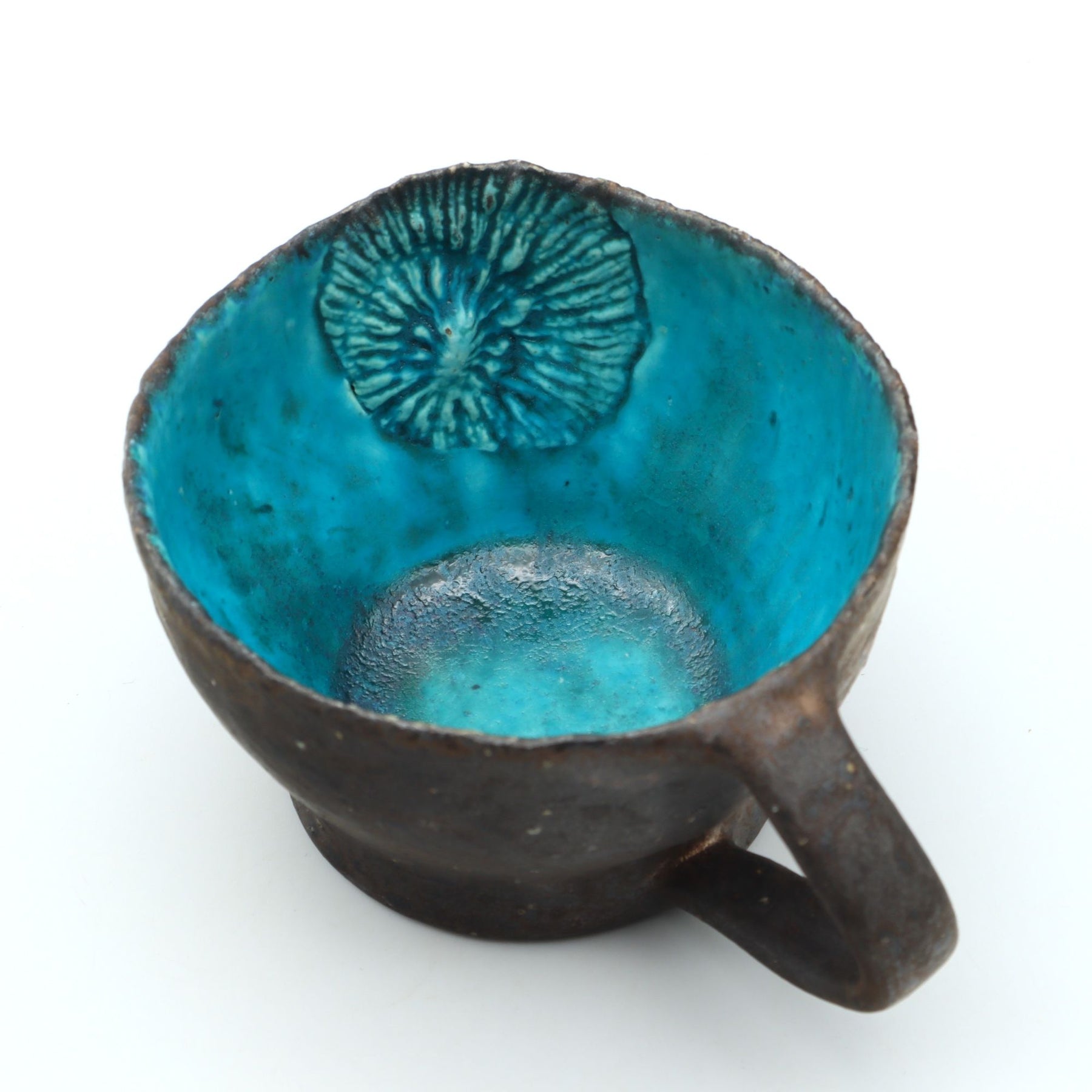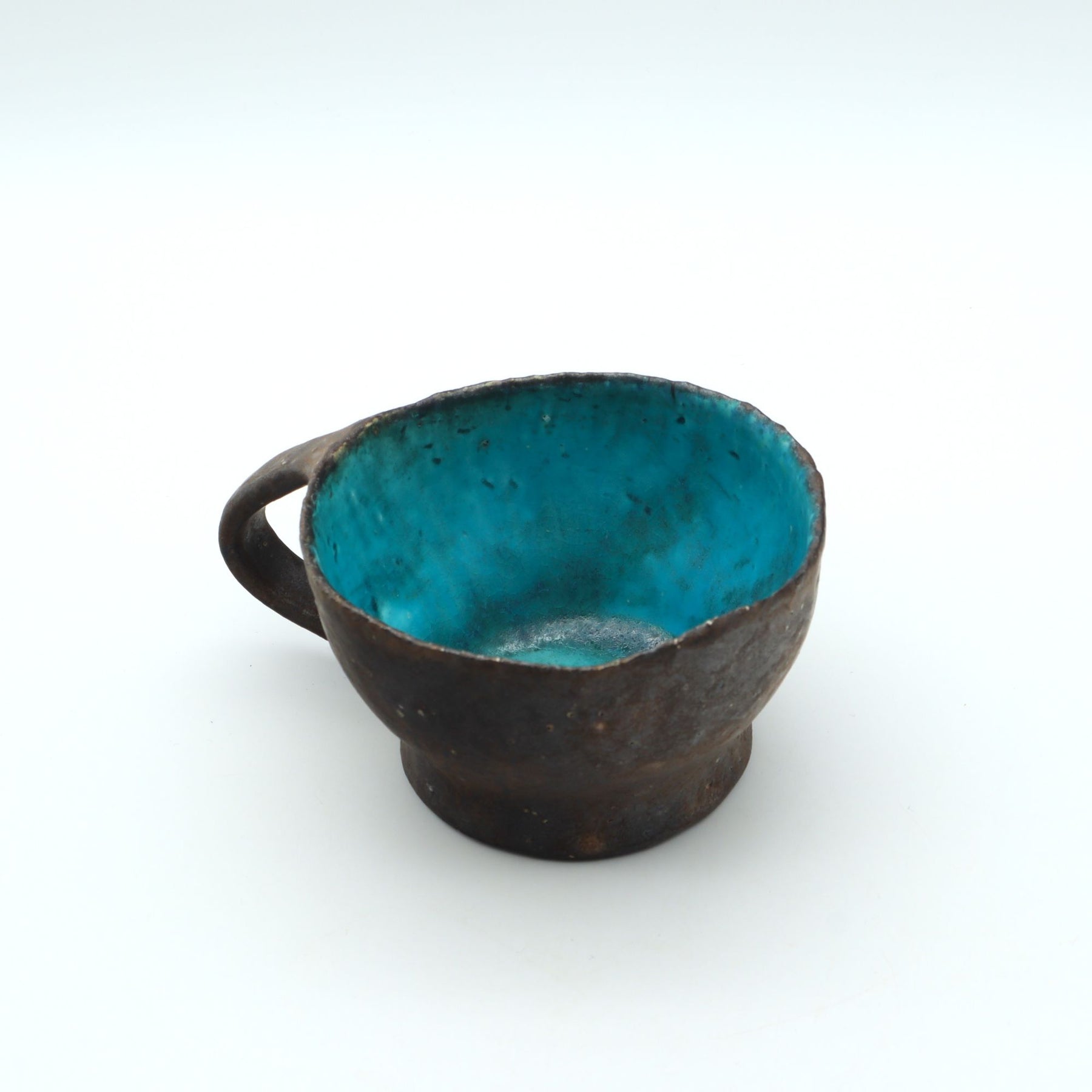 内側に施された凹凸の模様、青の釉薬の色味、ブロンズ色のハンドルやゆらぎのあるラインがアンティークな風合いを醸し出し、他にはない魅力的ななカップになっています。