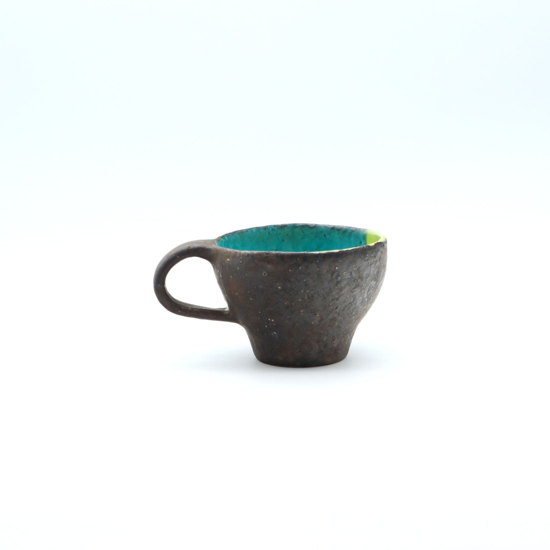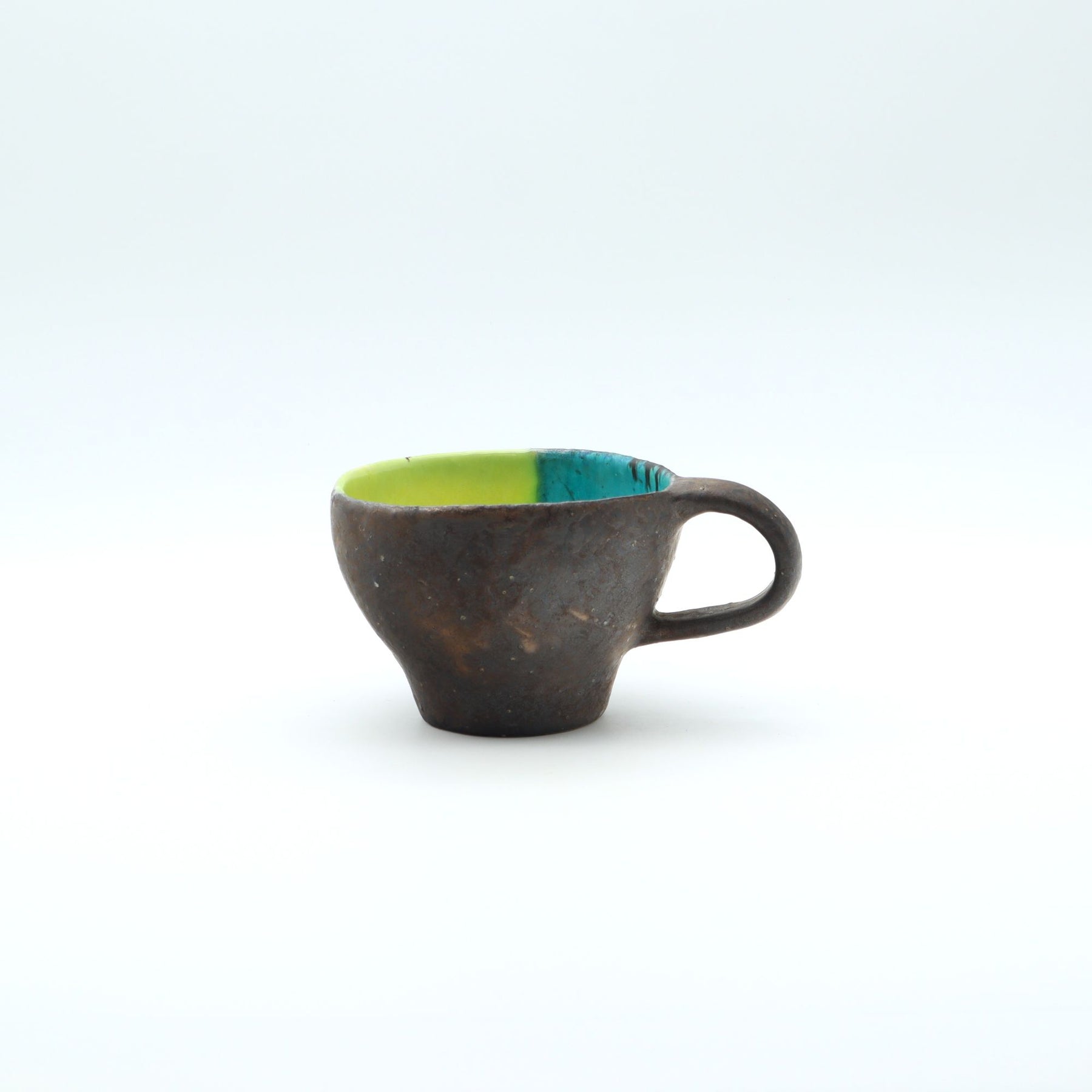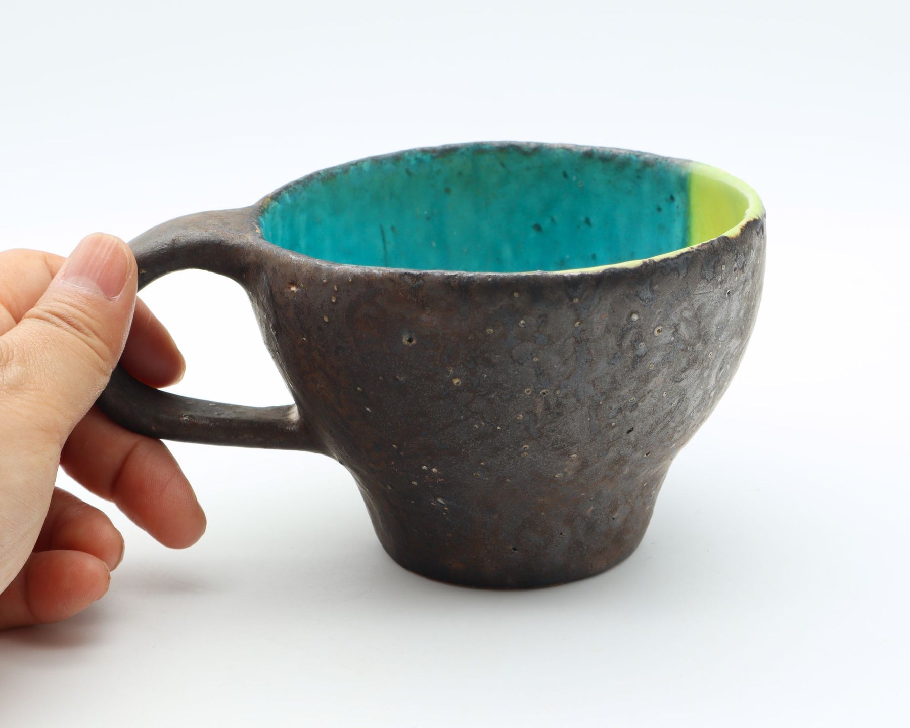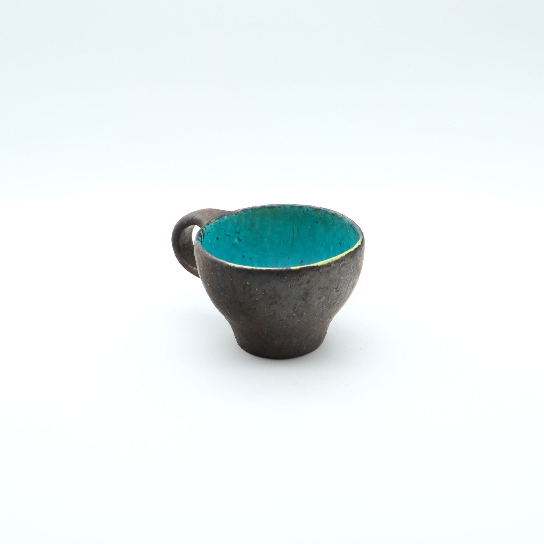 こちらは内側の美しい青に、鮮やかな黄色が配された印象的なカップ。青い釉薬は作家自身が調合して作るオリジナルの釉薬で、生まれ育った洞爺湖町の湖、海、碧空、草木などの自然の色を自身なりの色で表現したいという思いから、実験を繰り返した末に誕生したもの。十数年前からぬか床のように作り足しながら使っているという、作家さんの一番代表的な色です。