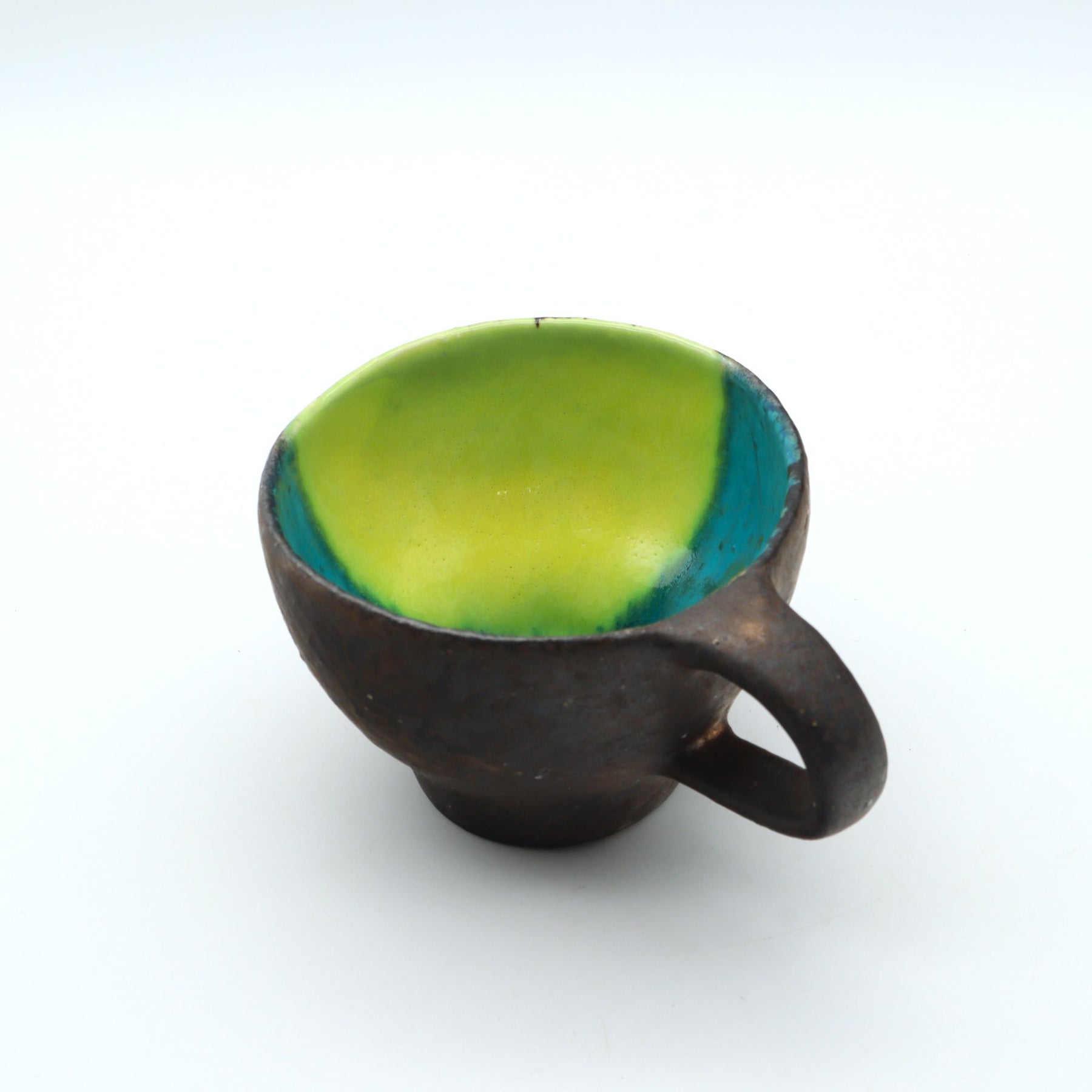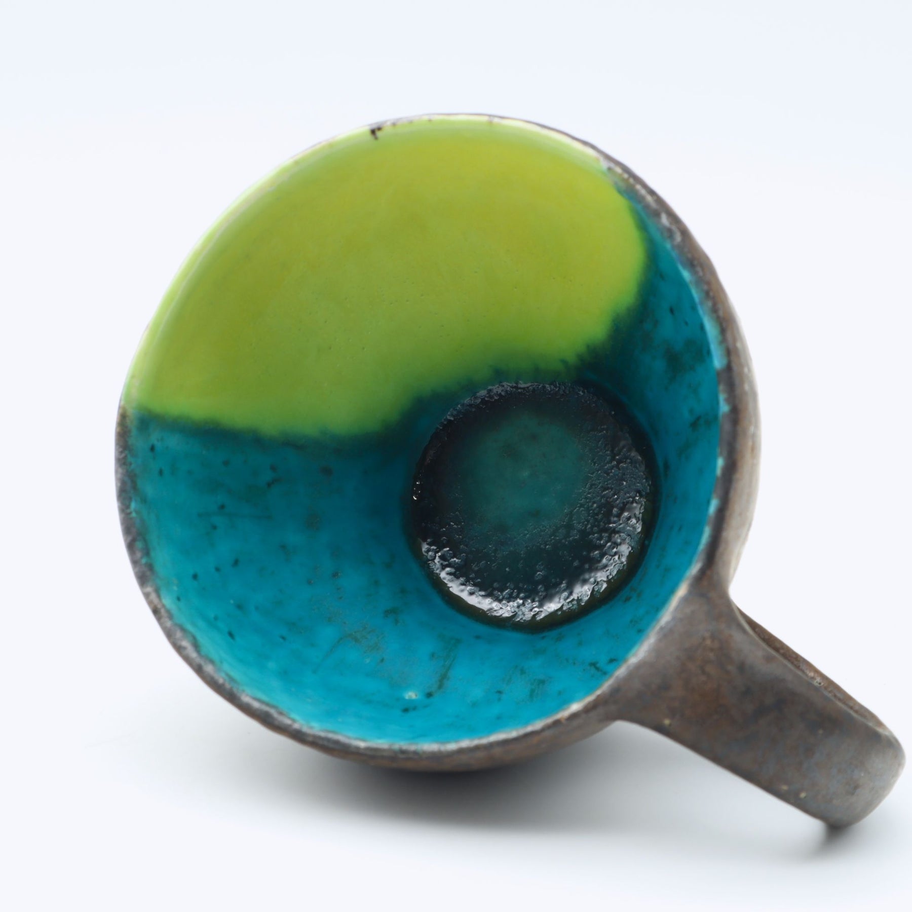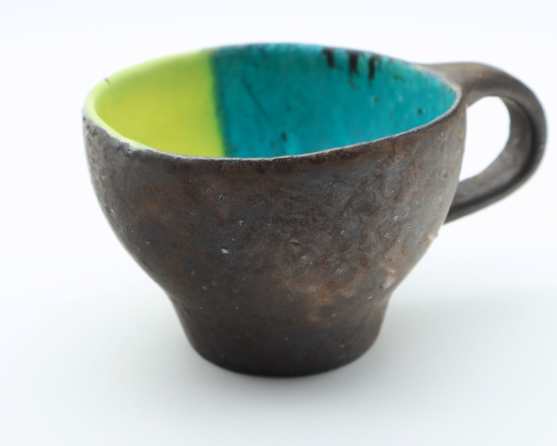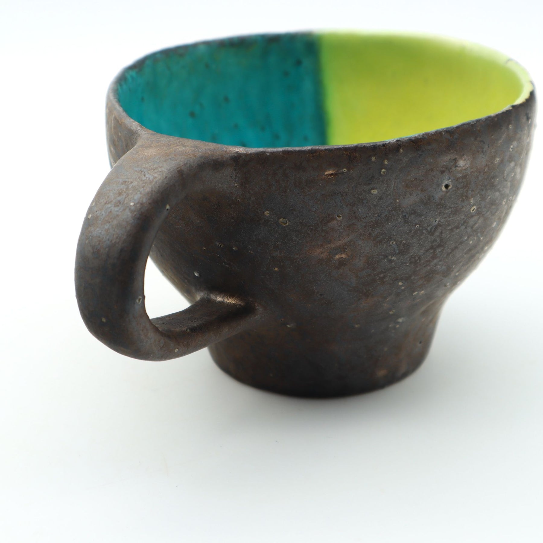 外側のブロンズ色とのコントラストが美しい内側の青と黄色のカラーリング、カーブしたフォルム、横長のハンドルなど他にはない個性あふれるカップです。