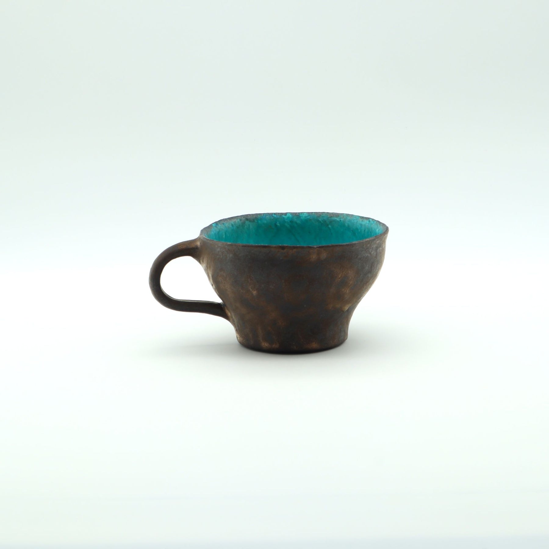 カップの外側は焼くと金色に発色するマンガン窯変釉によって金属のように見える仕上がり。厚く施釉した部分が金色に発色するため、敢えてムラが出るように筆を使って濃淡をつけています。使うほどに艶が増してくるので、経年変化も楽しめます。