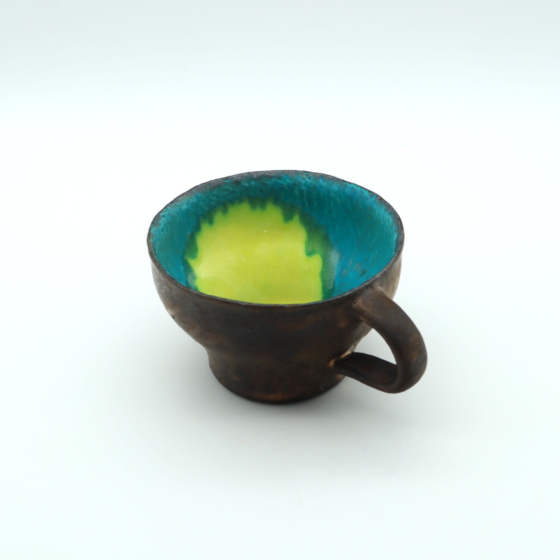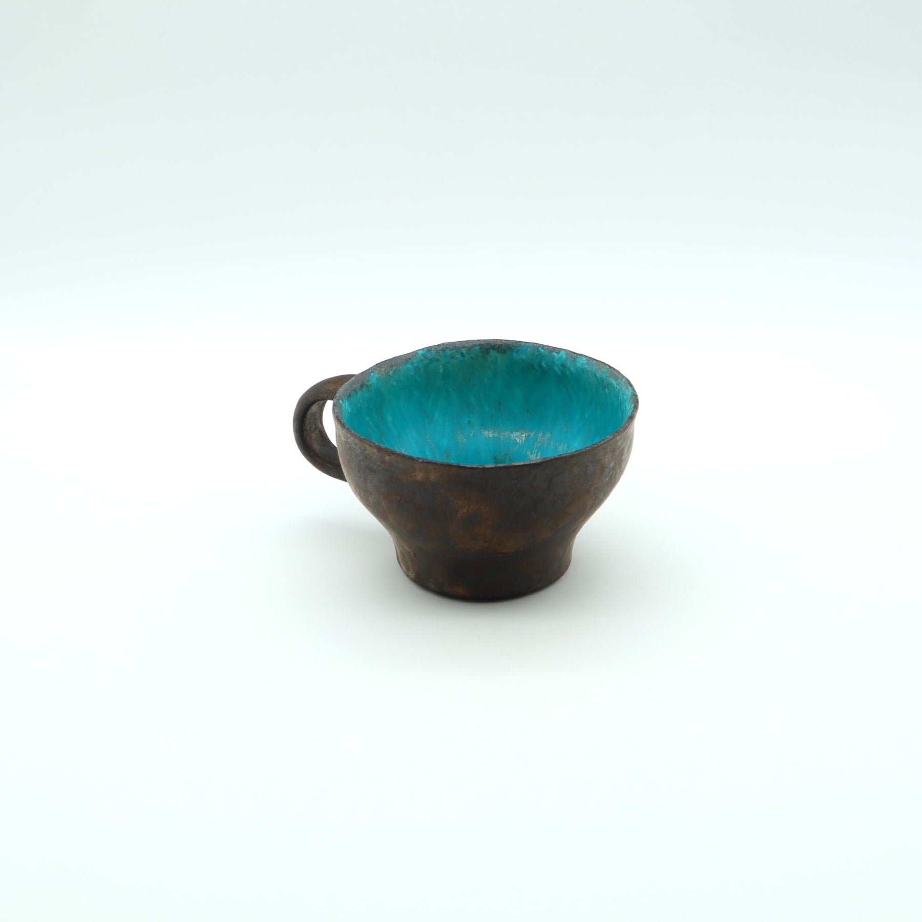 外側のブロンズ色とのコントラストが美しい内側の青と黄色のカラーリング、カーブしたフォルムなど他にはない個性あふれるカップです。アイスやヨーグルトなどデザートカップとしても素敵です。