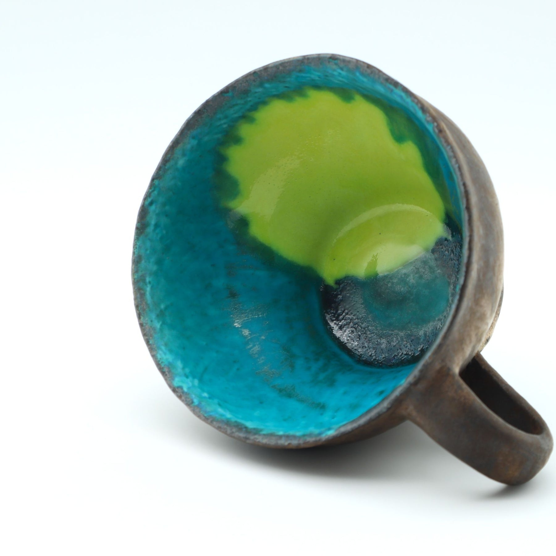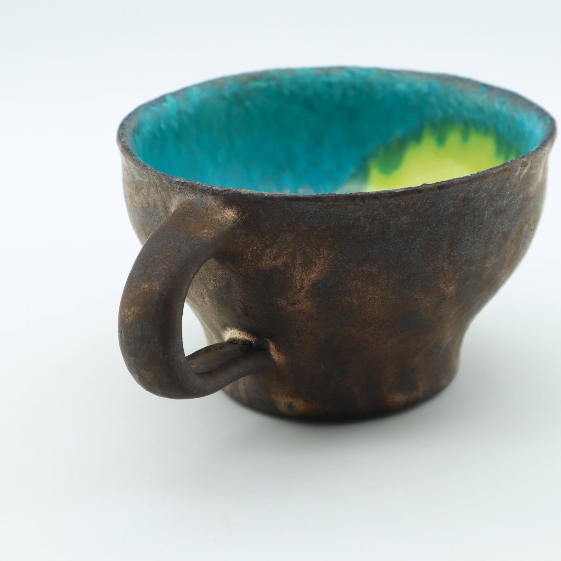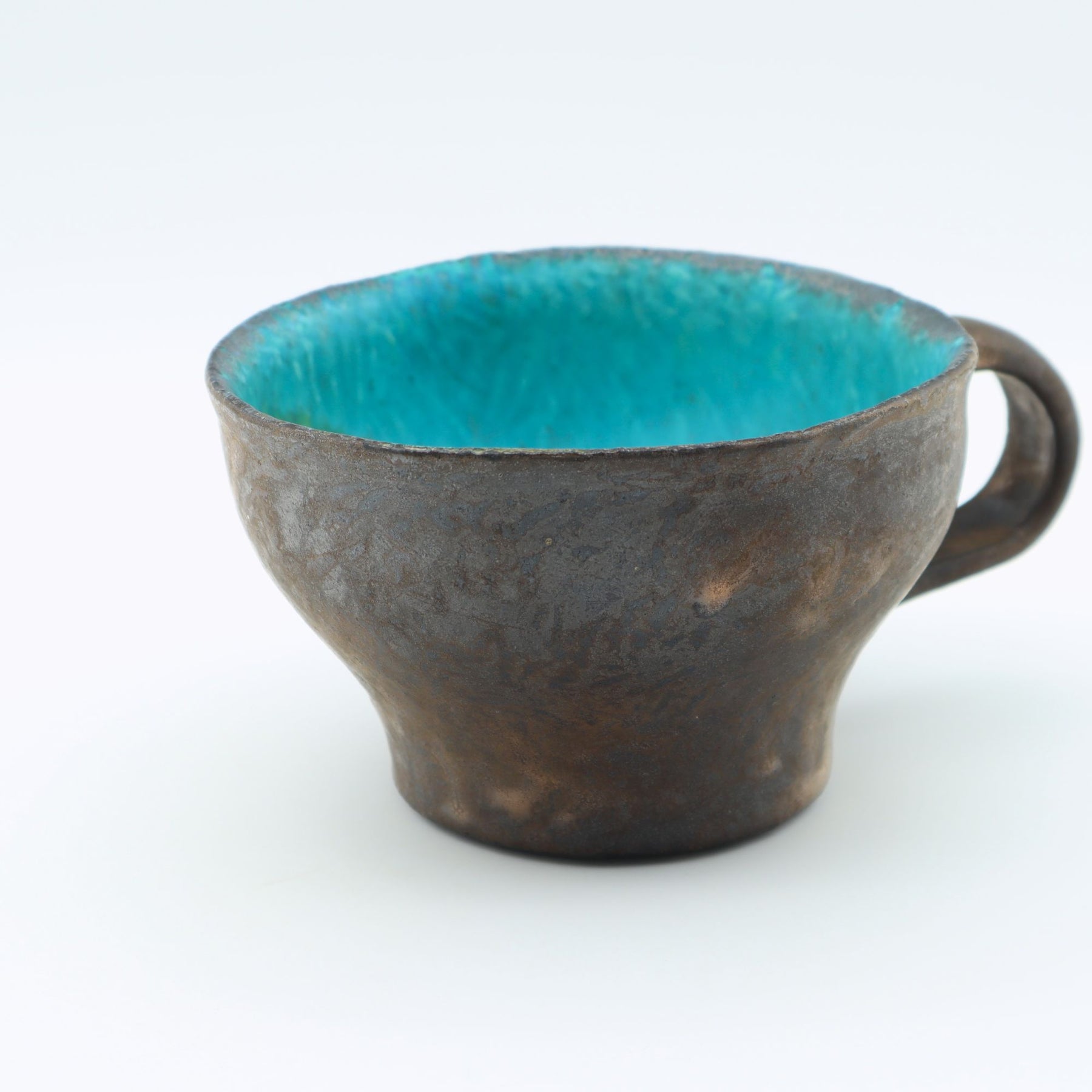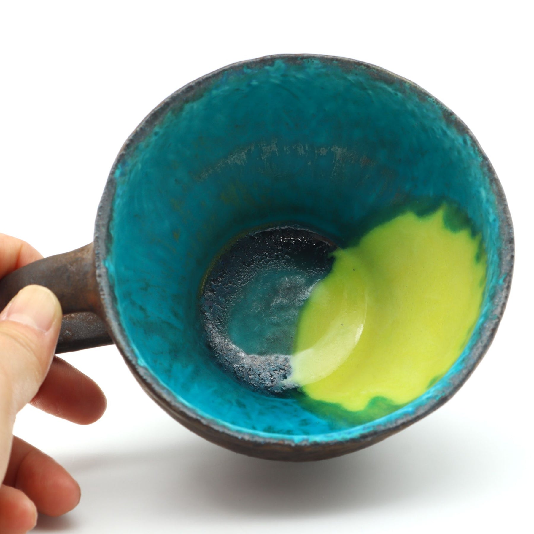 こちらは内側の美しい青に、鮮やかな黄色が配された印象的なカップ。青い釉薬は作家自身が調合して作るオリジナルの釉薬で、生まれ育った洞爺湖町の湖、海、碧空、草木などの自然の色を自身なりの色で表現したいという思いから、実験を繰り返した末に誕生したもの。十数年前からぬか床のように作り足しながら使っているという、作家さんの一番代表的な色です。