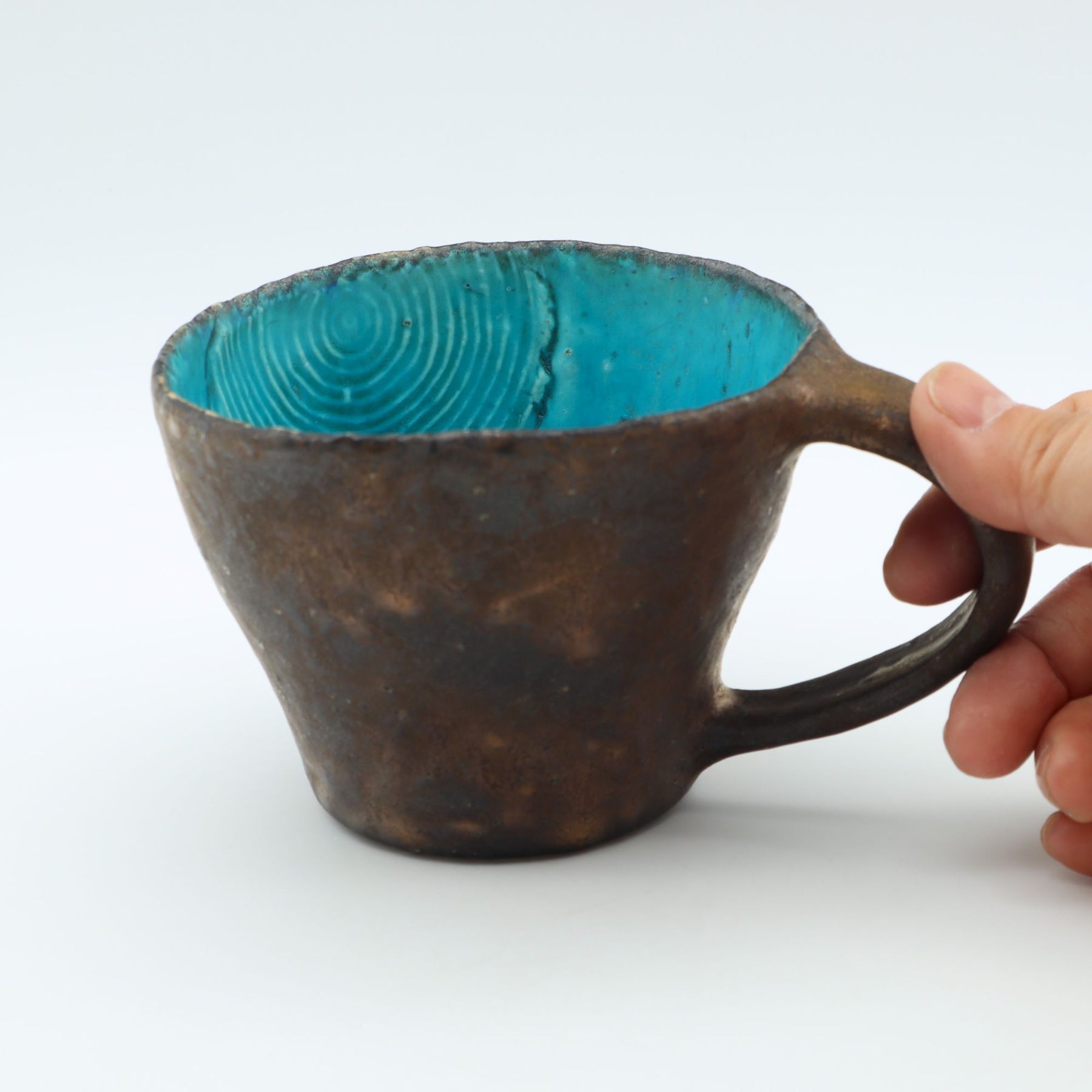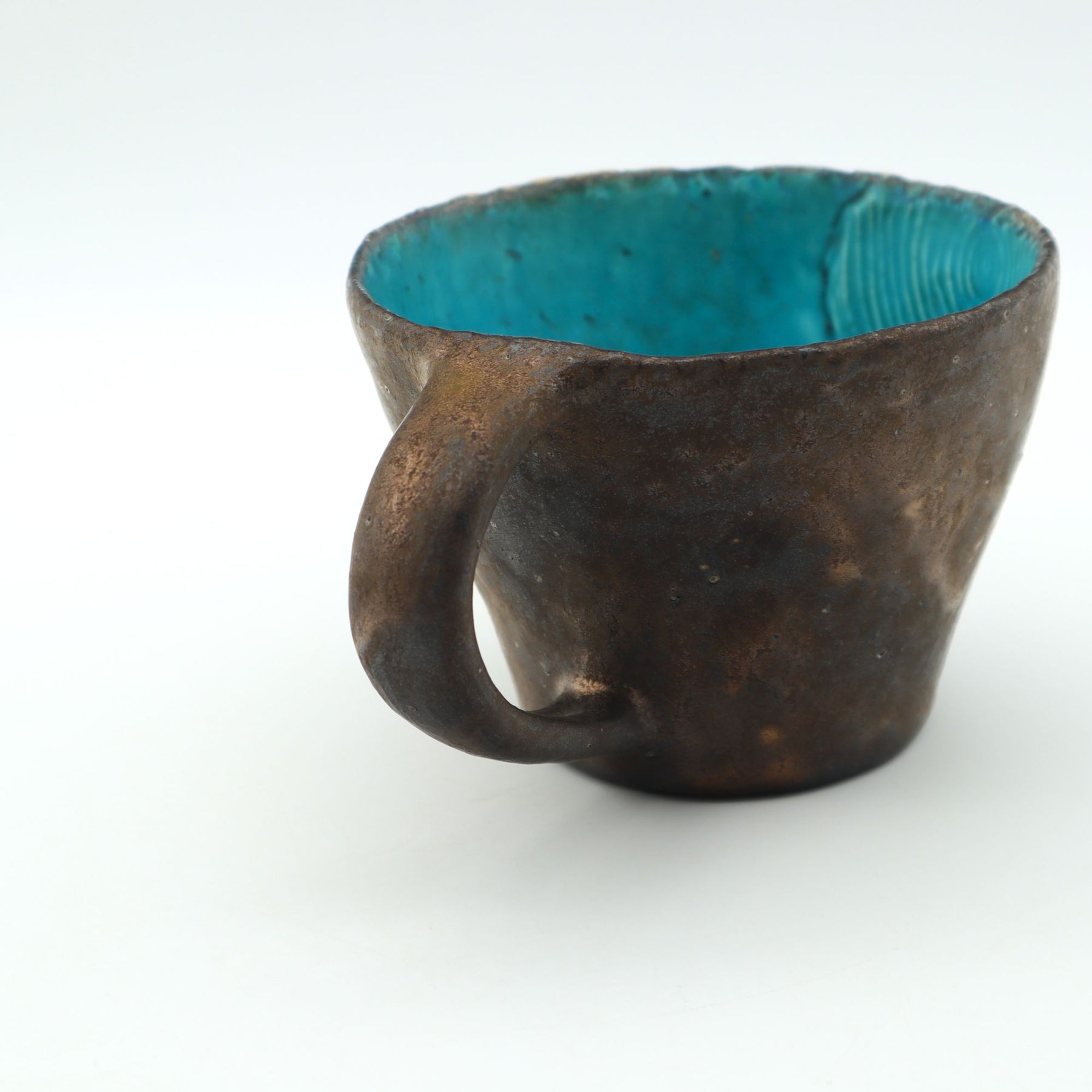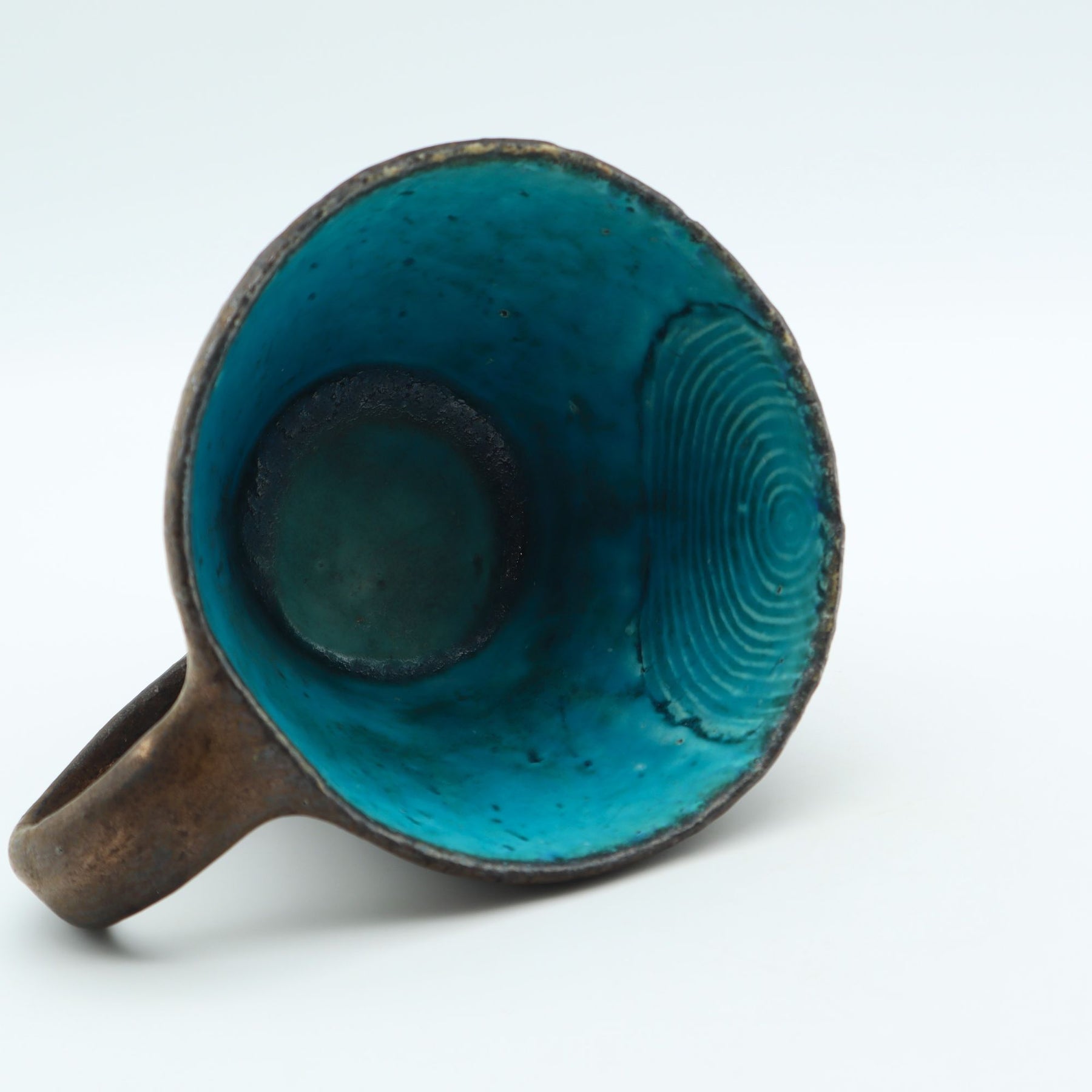 内側に施された模様、青の釉薬の色味、ブロンズ色のハンドルやゆらぎのあるラインがアンティークな風合いを醸し出し、他にはない魅力的ななカップになっています。