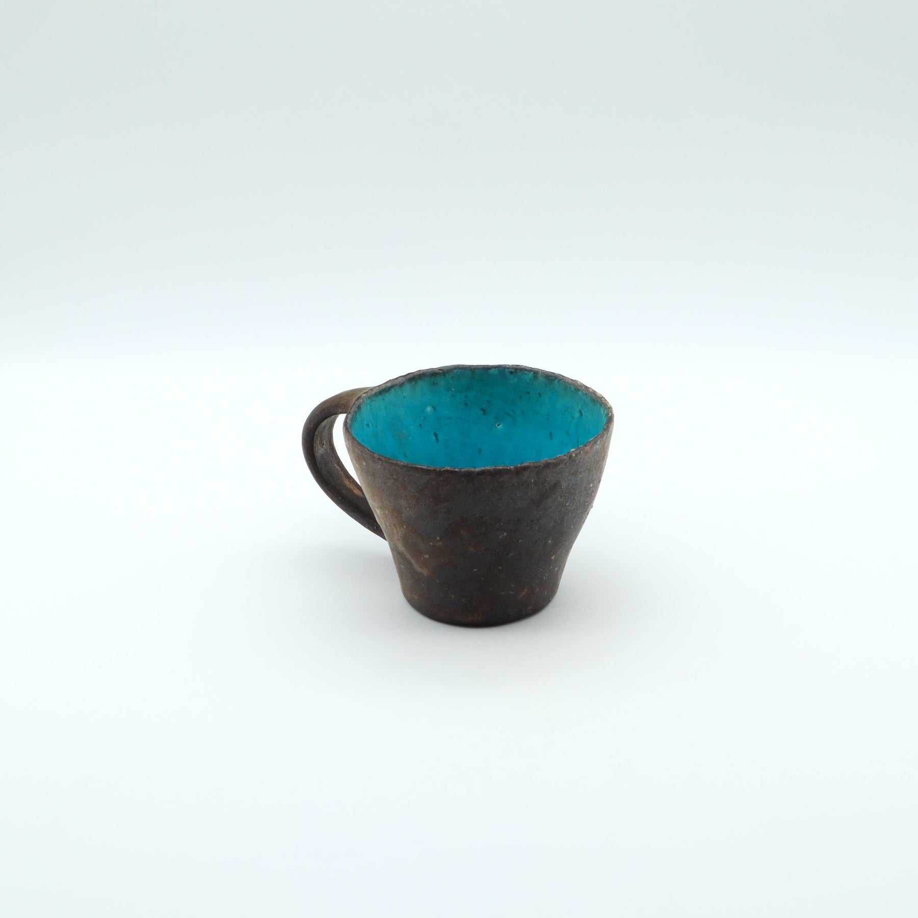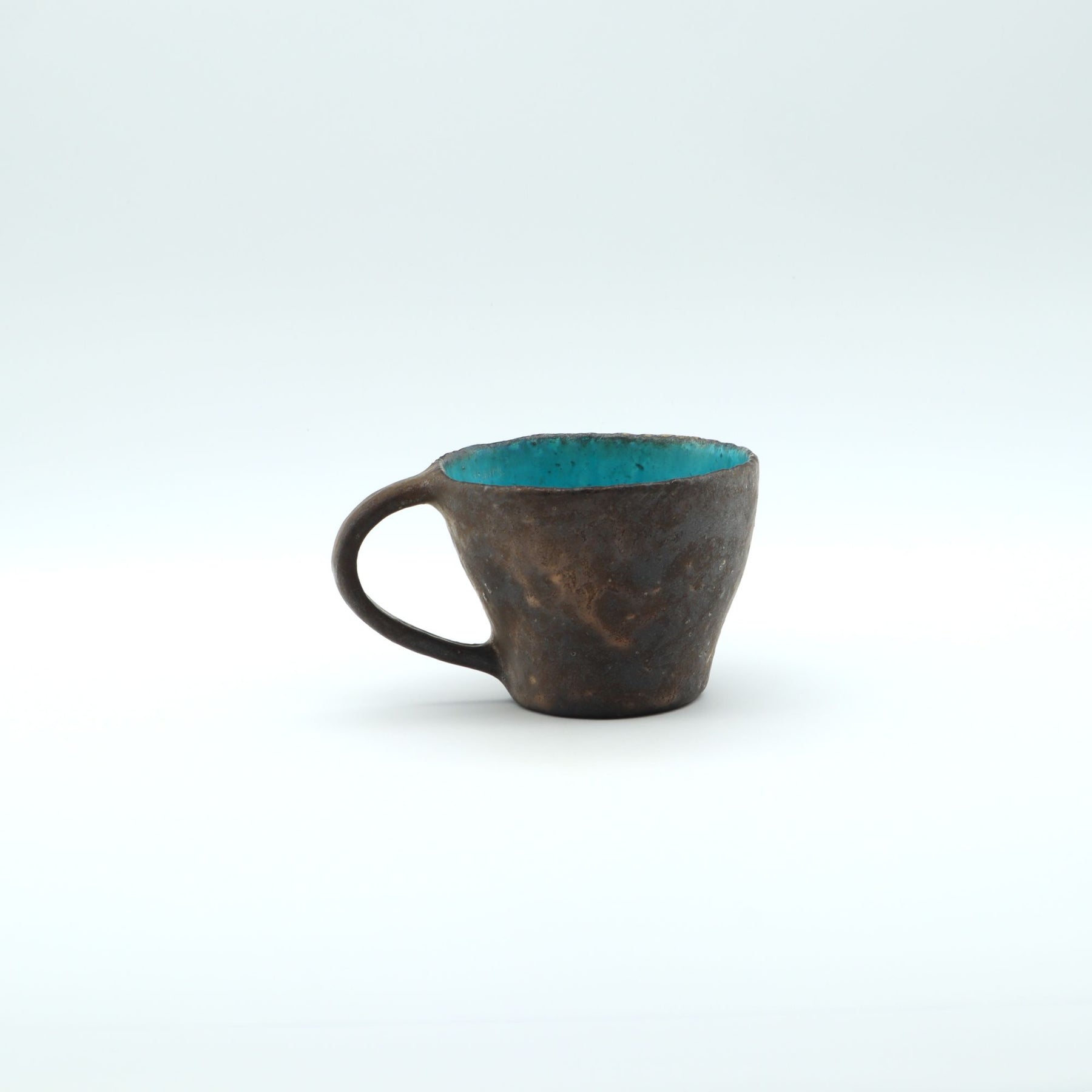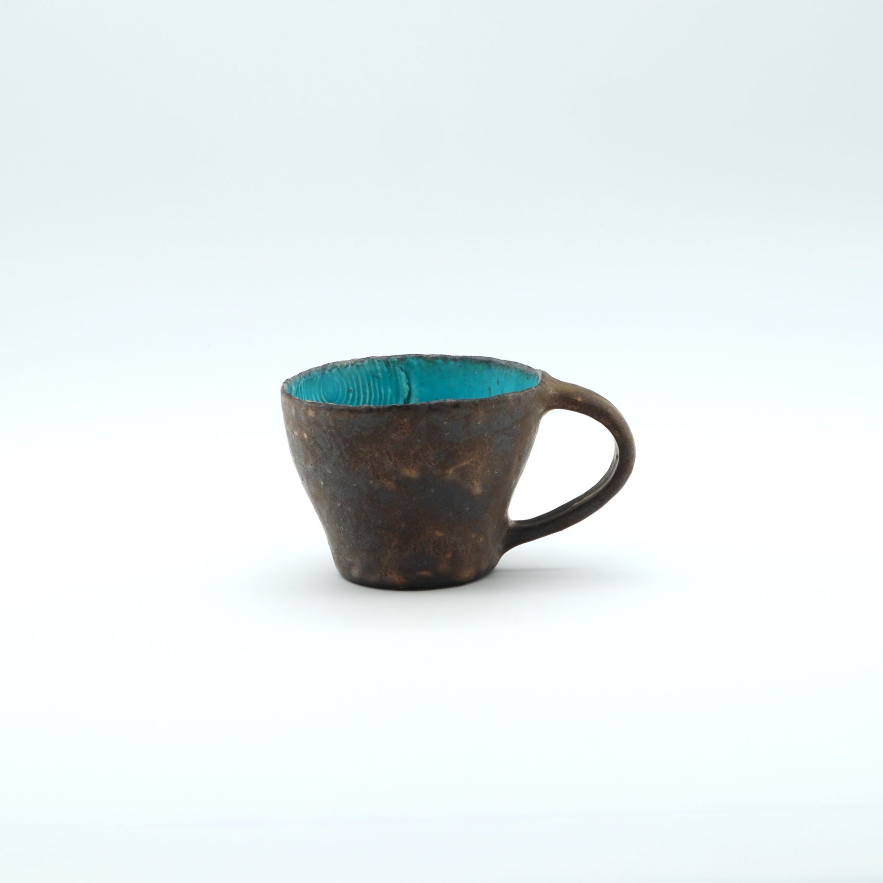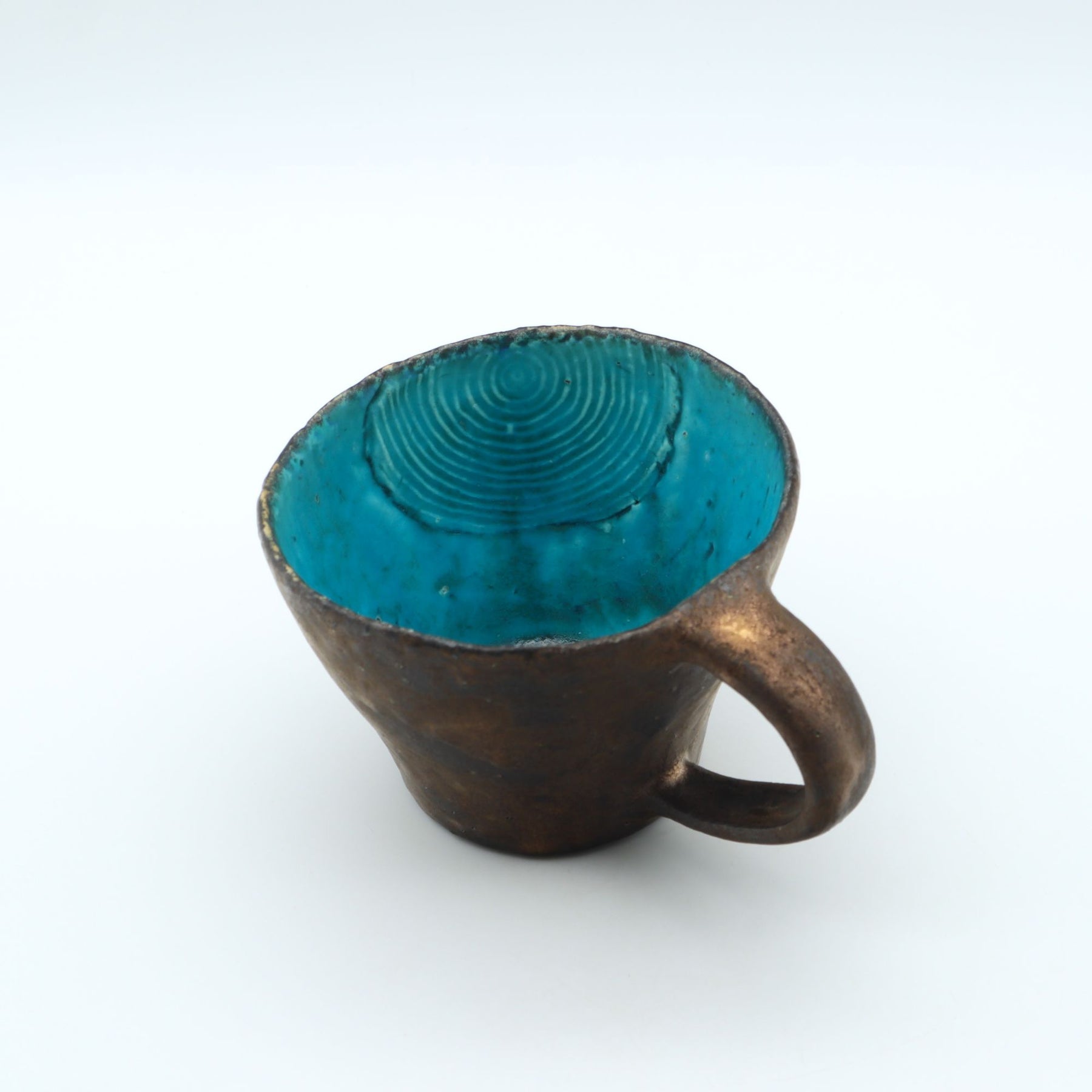 内側に施された模様、青の釉薬の色味、ブロンズ色のハンドルやゆらぎのあるラインがアンティークな風合いを醸し出し、他にはない魅力的ななカップになっています。