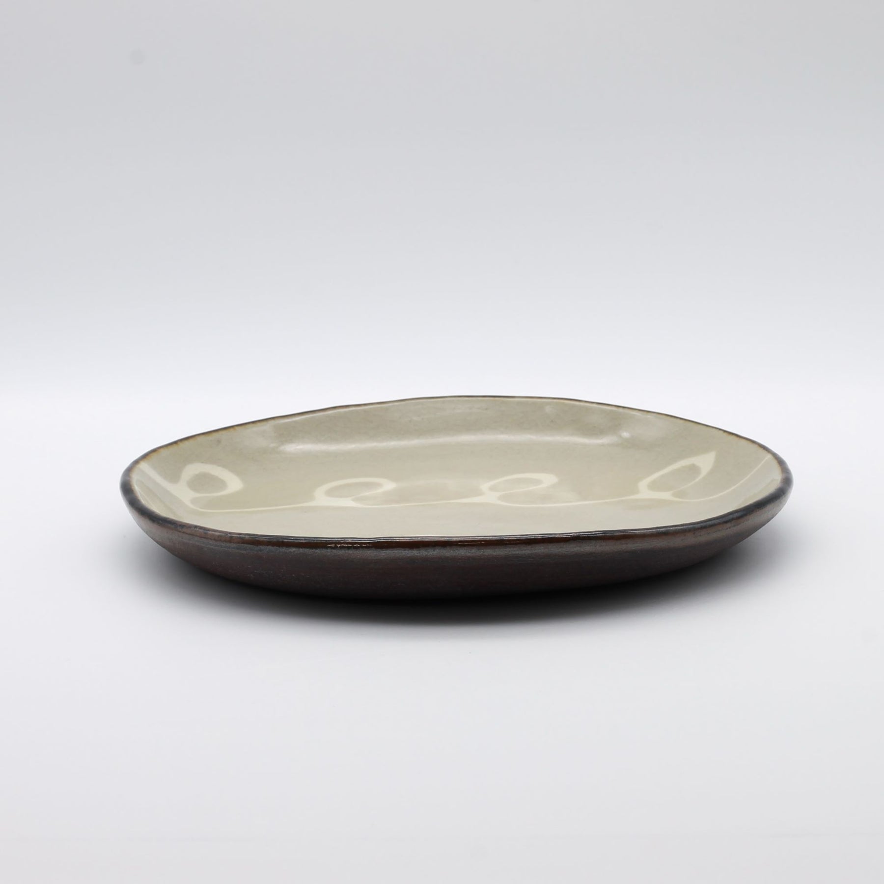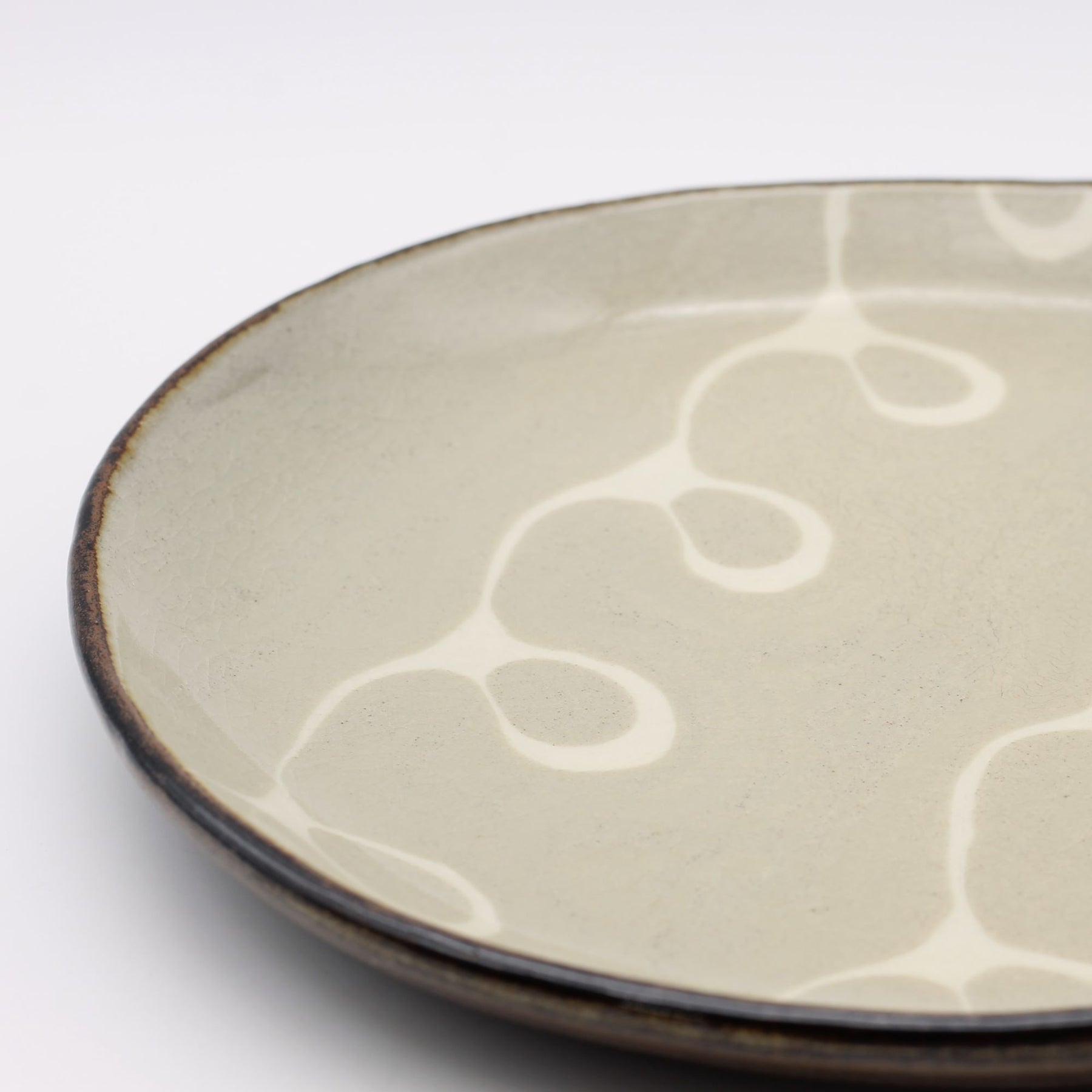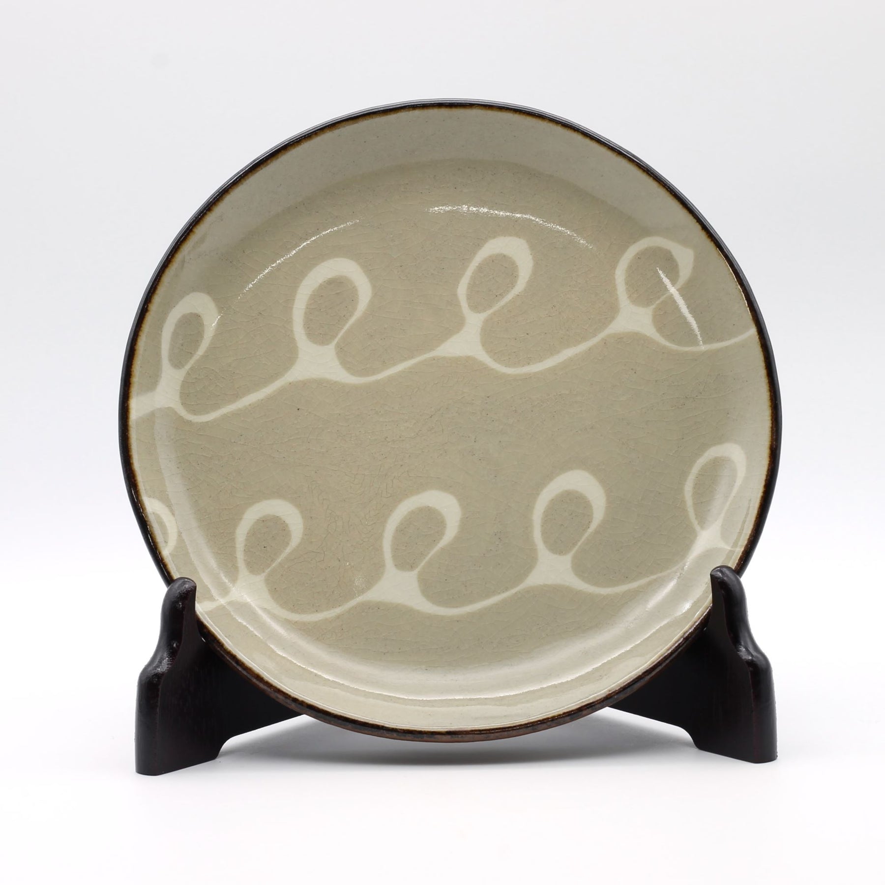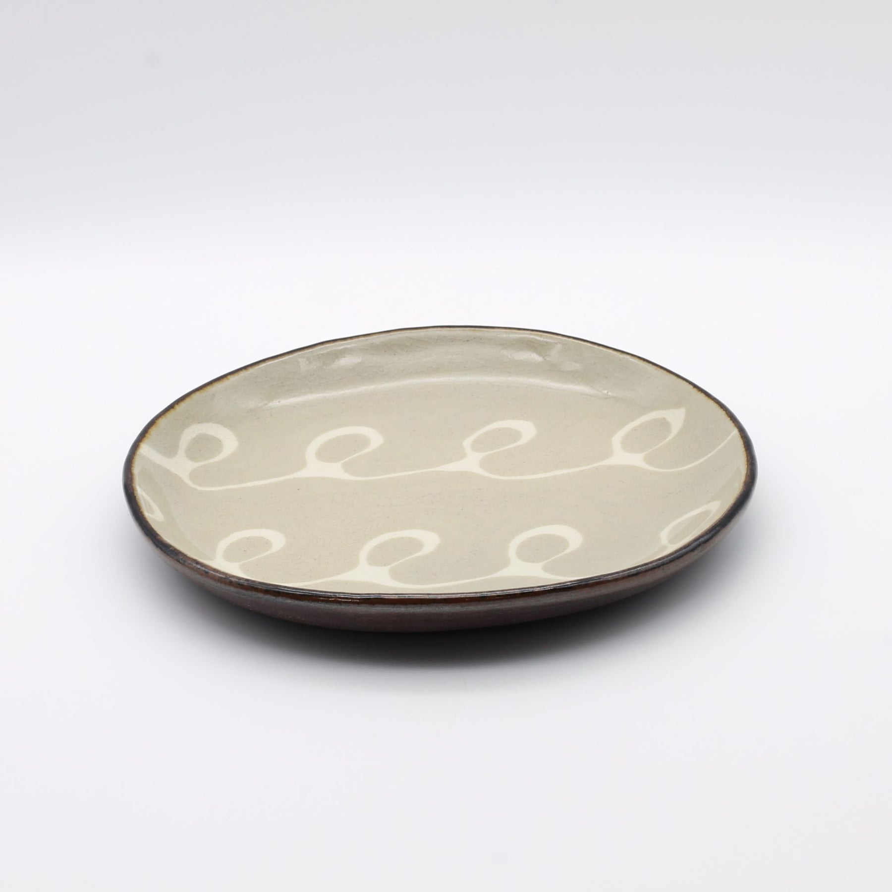 こちらは7寸サイズの丸皿。お皿の上にスリップウェアと呼ばれる技法でオリジナルの紋様が描かれており、ヨーロッパ的な風情をもちながら、どこか素朴で懐かしさも感じさせてくれます。ひとつひとつ紋様を描いていくので、同じ紋様でもそれぞれ異なる表情になるのが特長。まるでラテアートのようなスリップウェアにしか出せない紋様、料理を盛り付けたときに見える柄、器の重厚感など、お料理を一層引き立ててくれるスリップウェアの魅力が詰まったうつわです。
