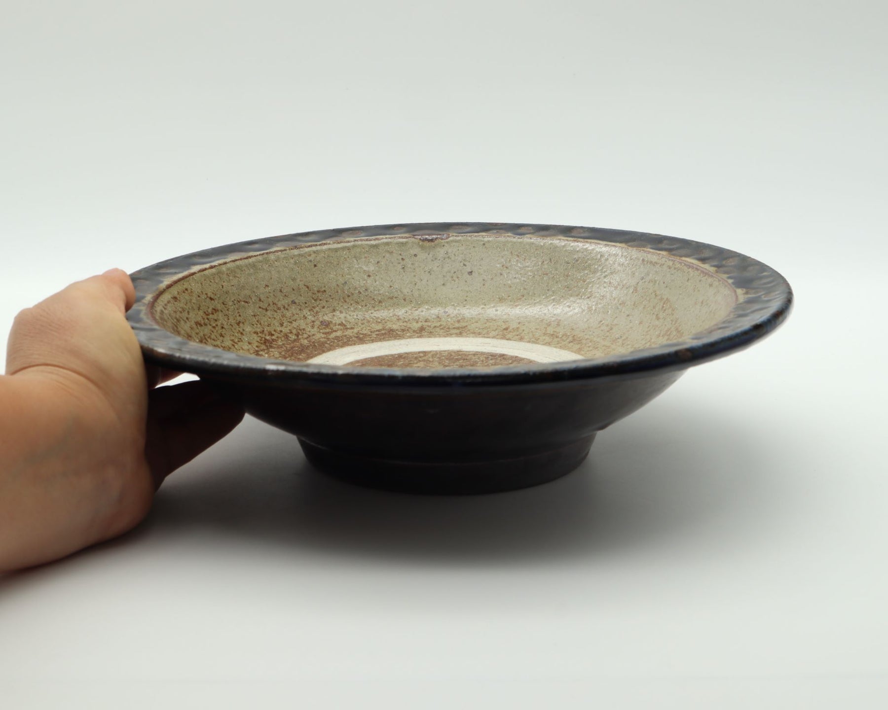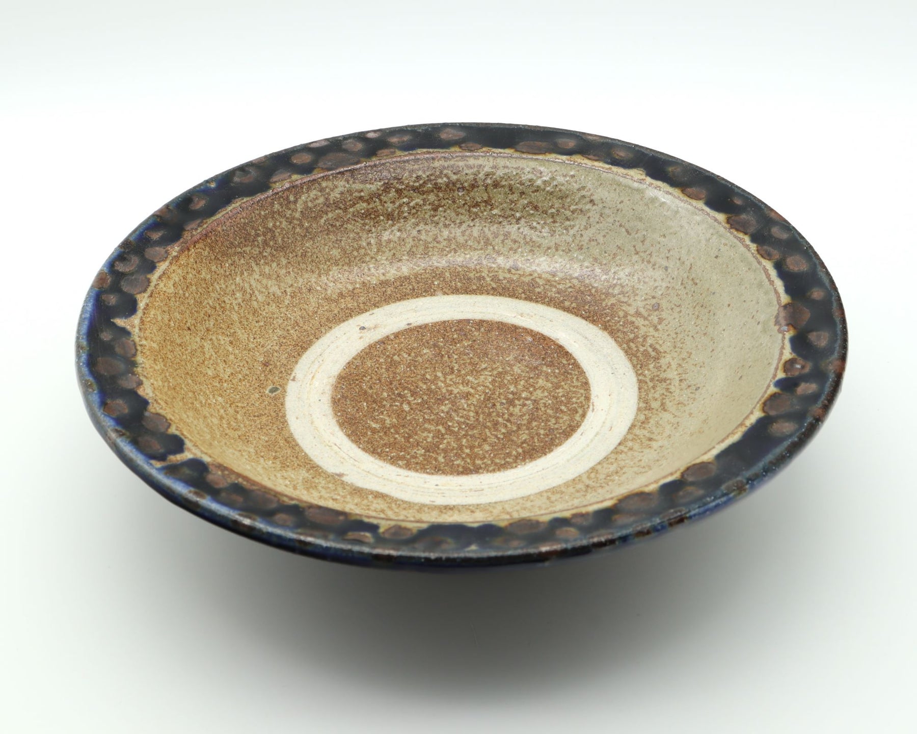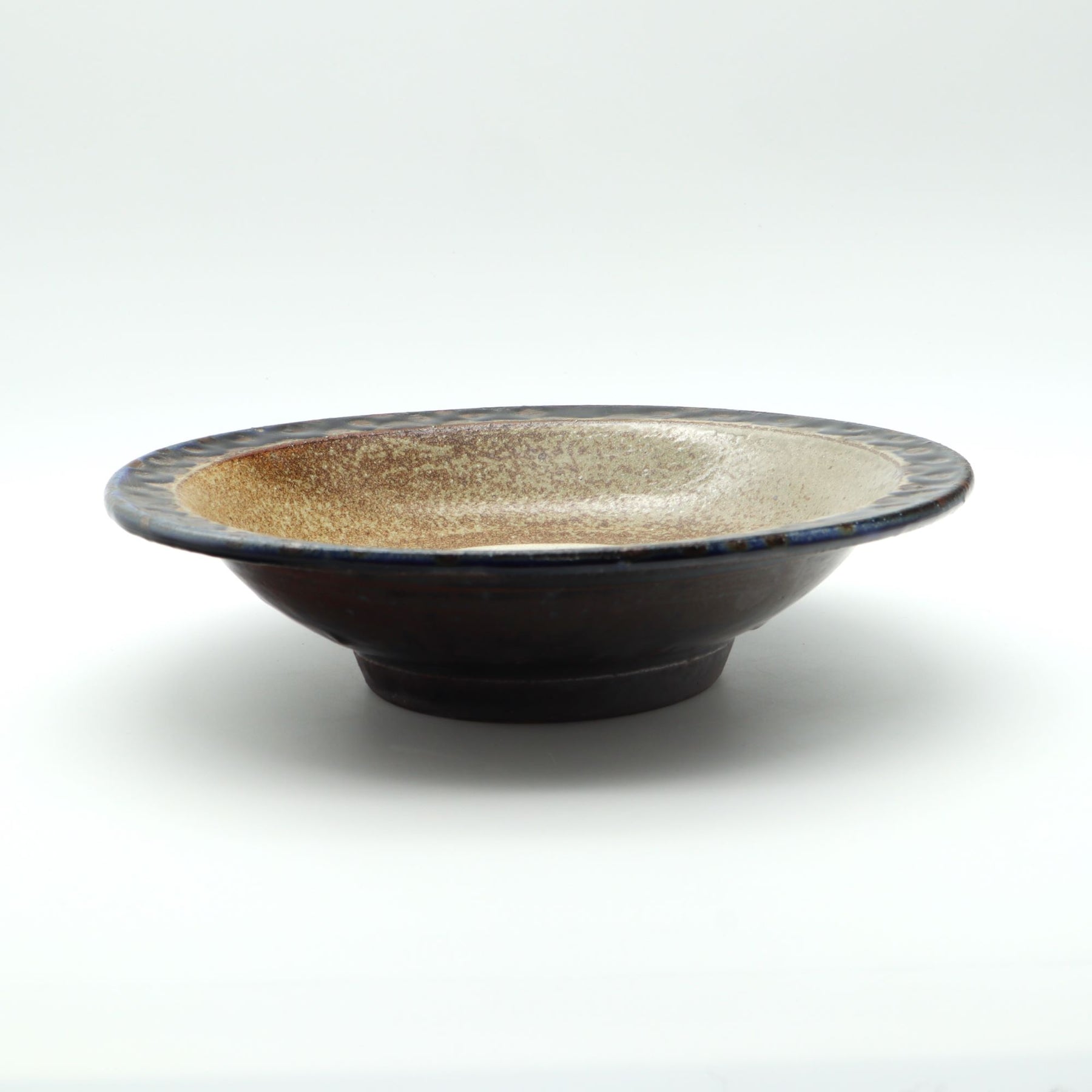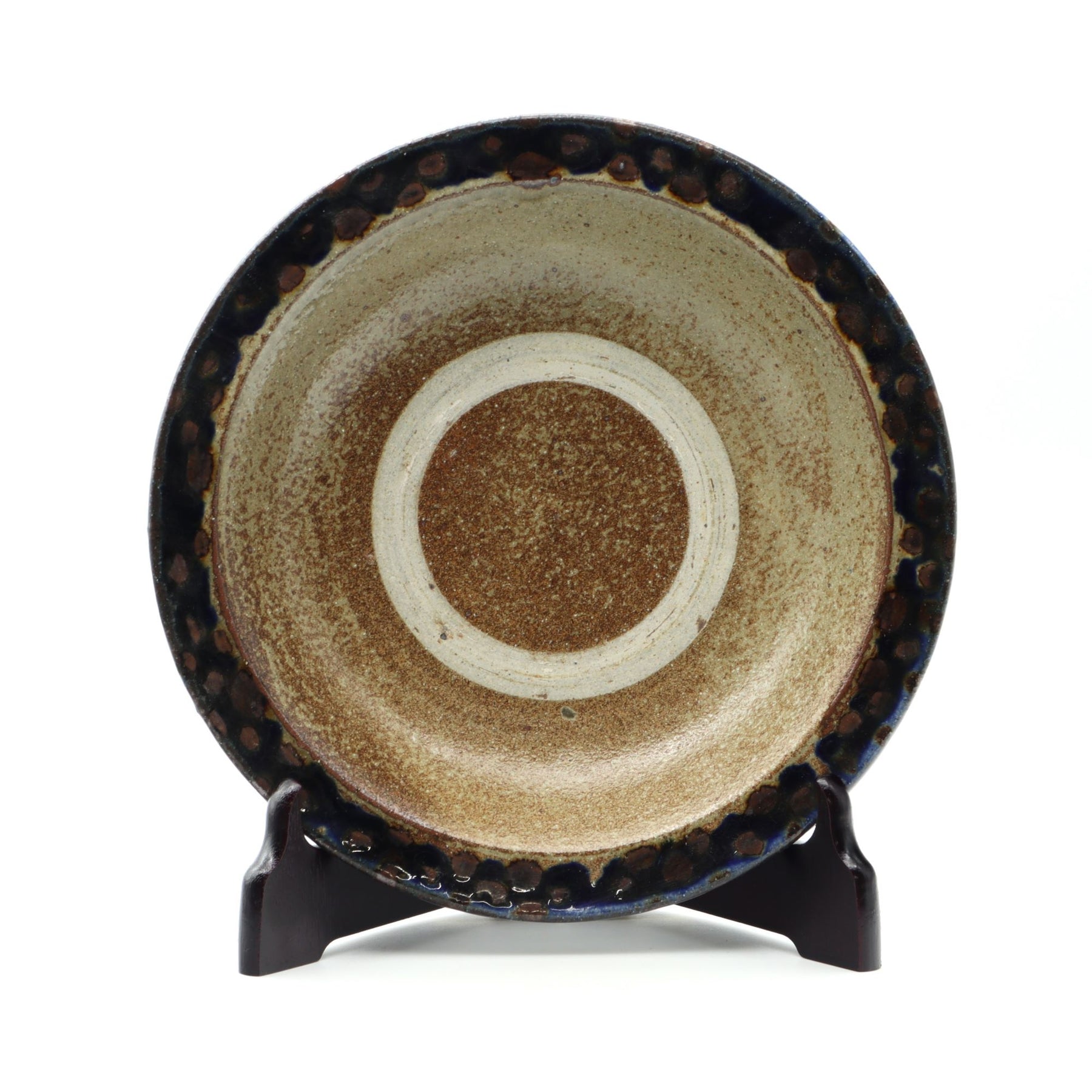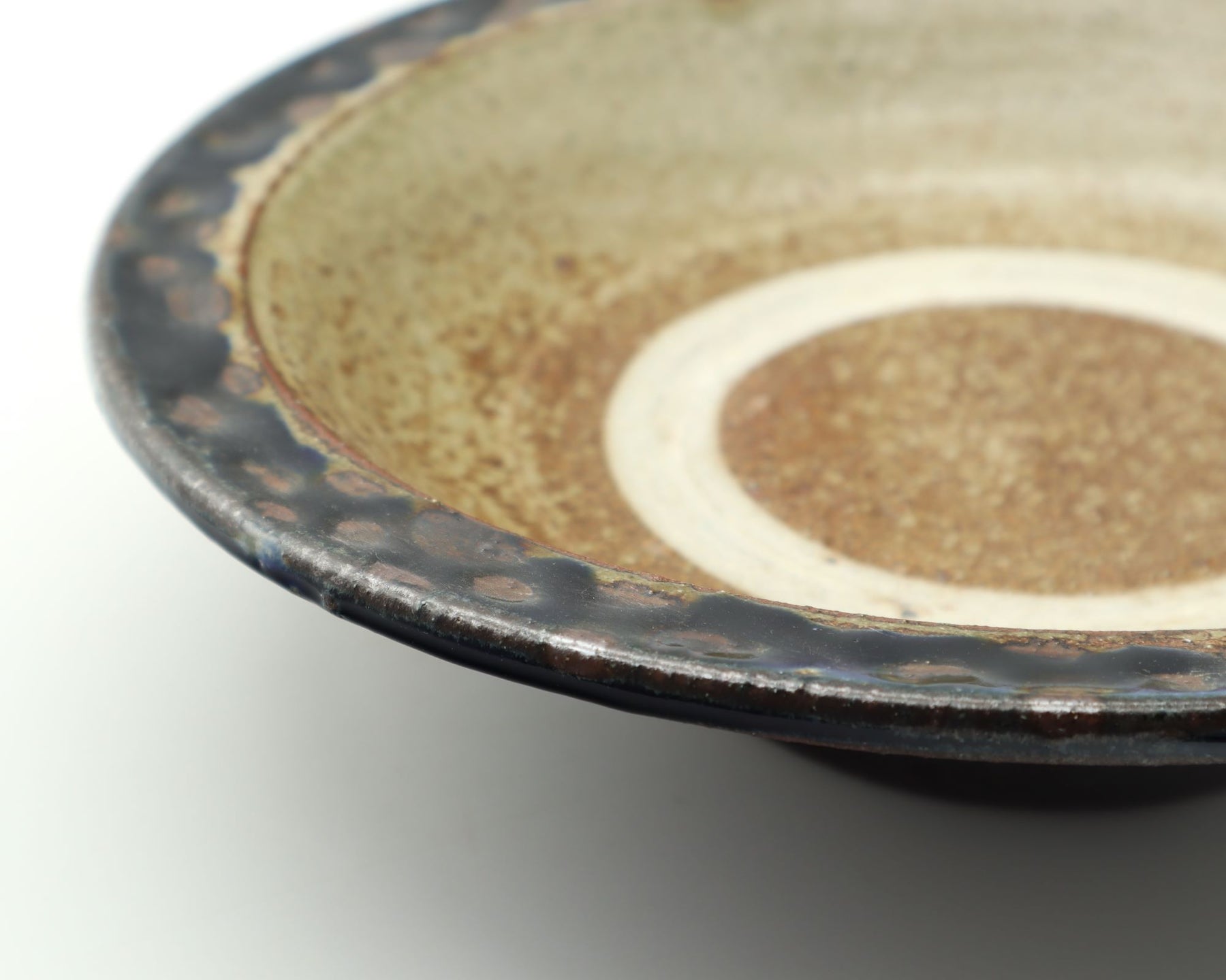こちらは8寸サイズの大皿で表面に蛇の目があるお皿。蛇の目とは器を重ねて焼成する際に、器同士がくっつくのを防ぐため、上に積む器の高台が当たる部分の釉薬をあらかじめはぎ取ってできる器中央の白い輪っかのこと。ザラりとした質感で経年変化が楽しめるのも特徴のひとつです。平らになった縁の模様がアクセントになっています。