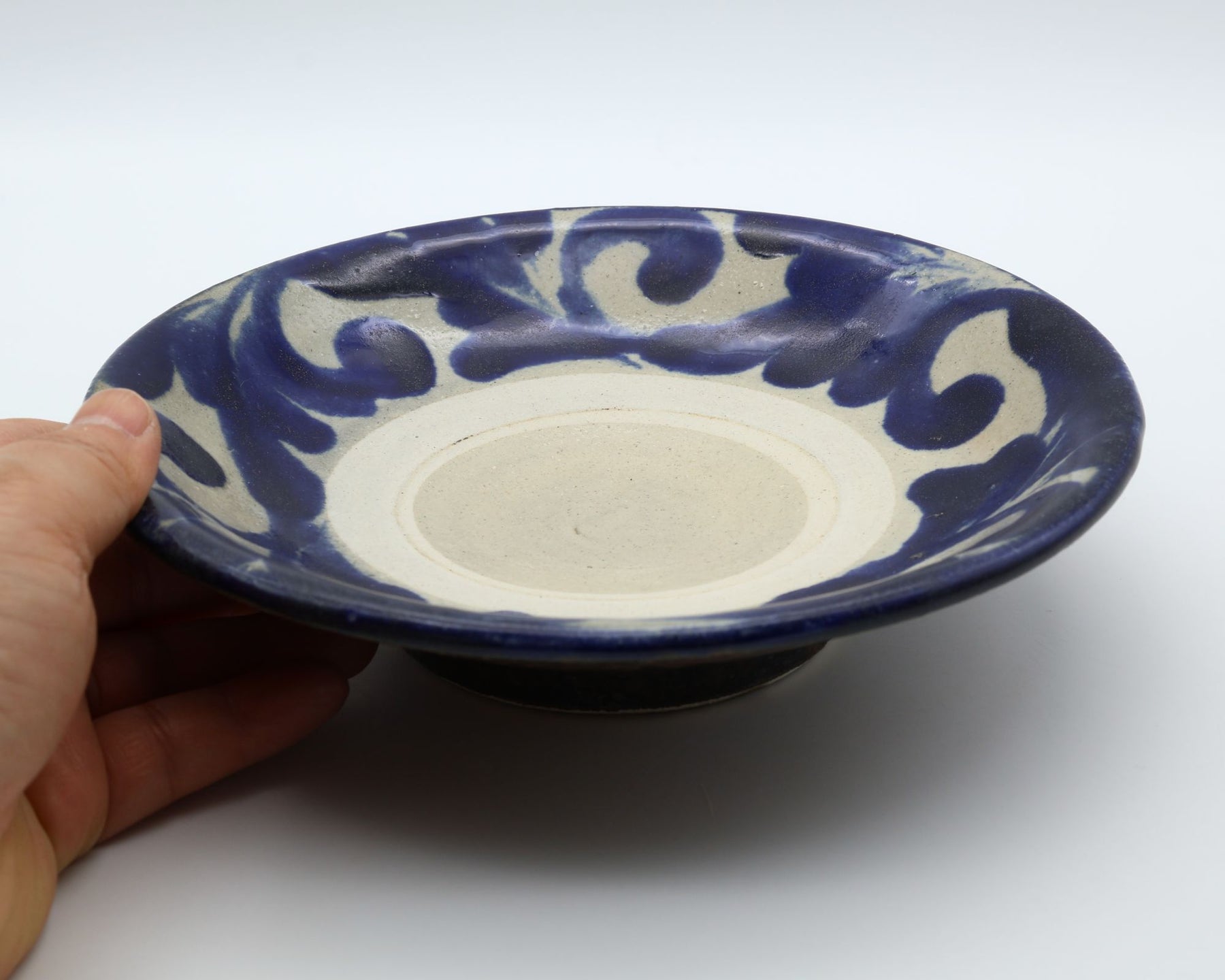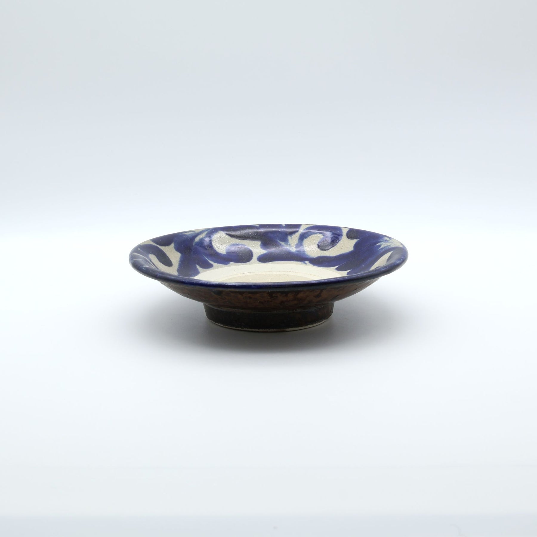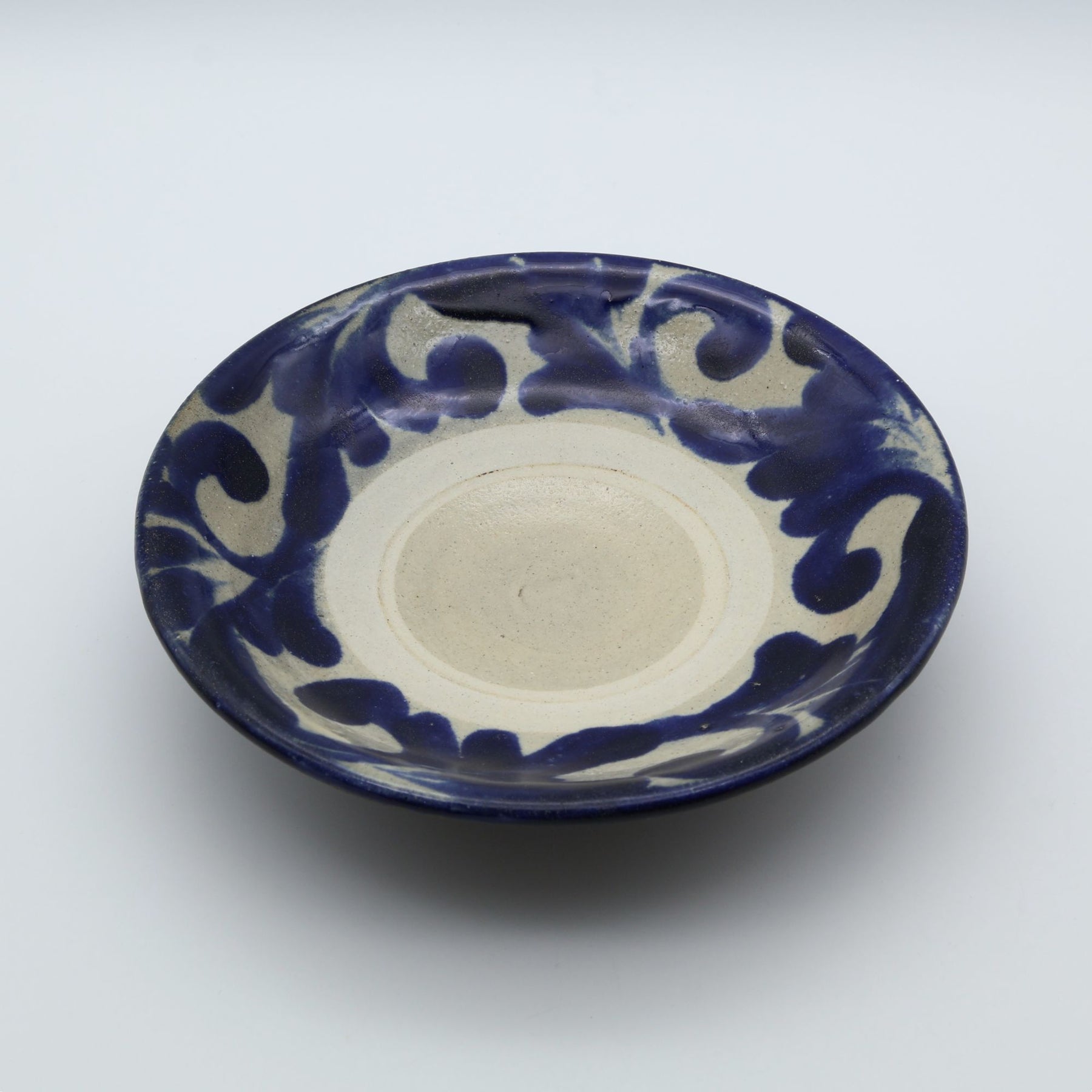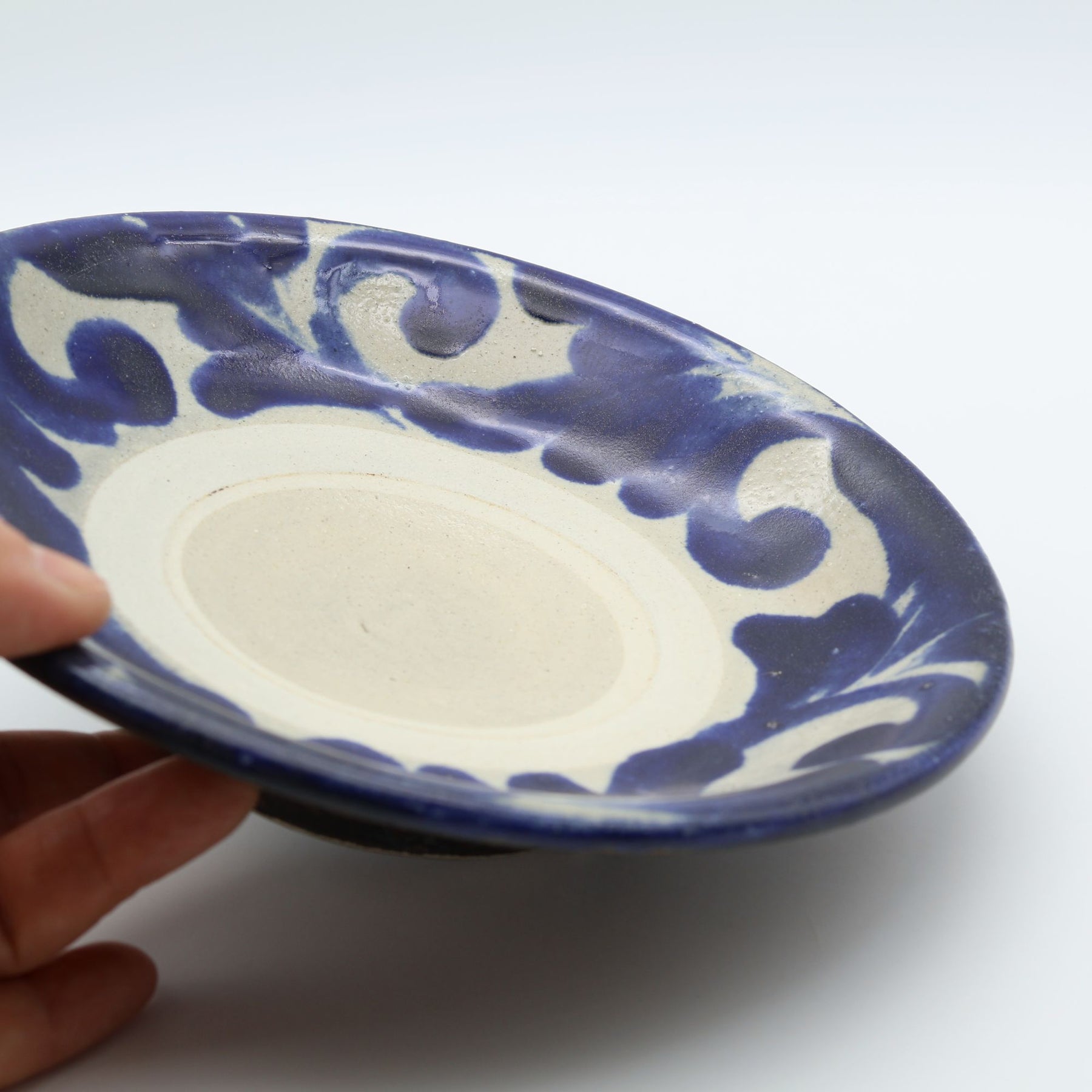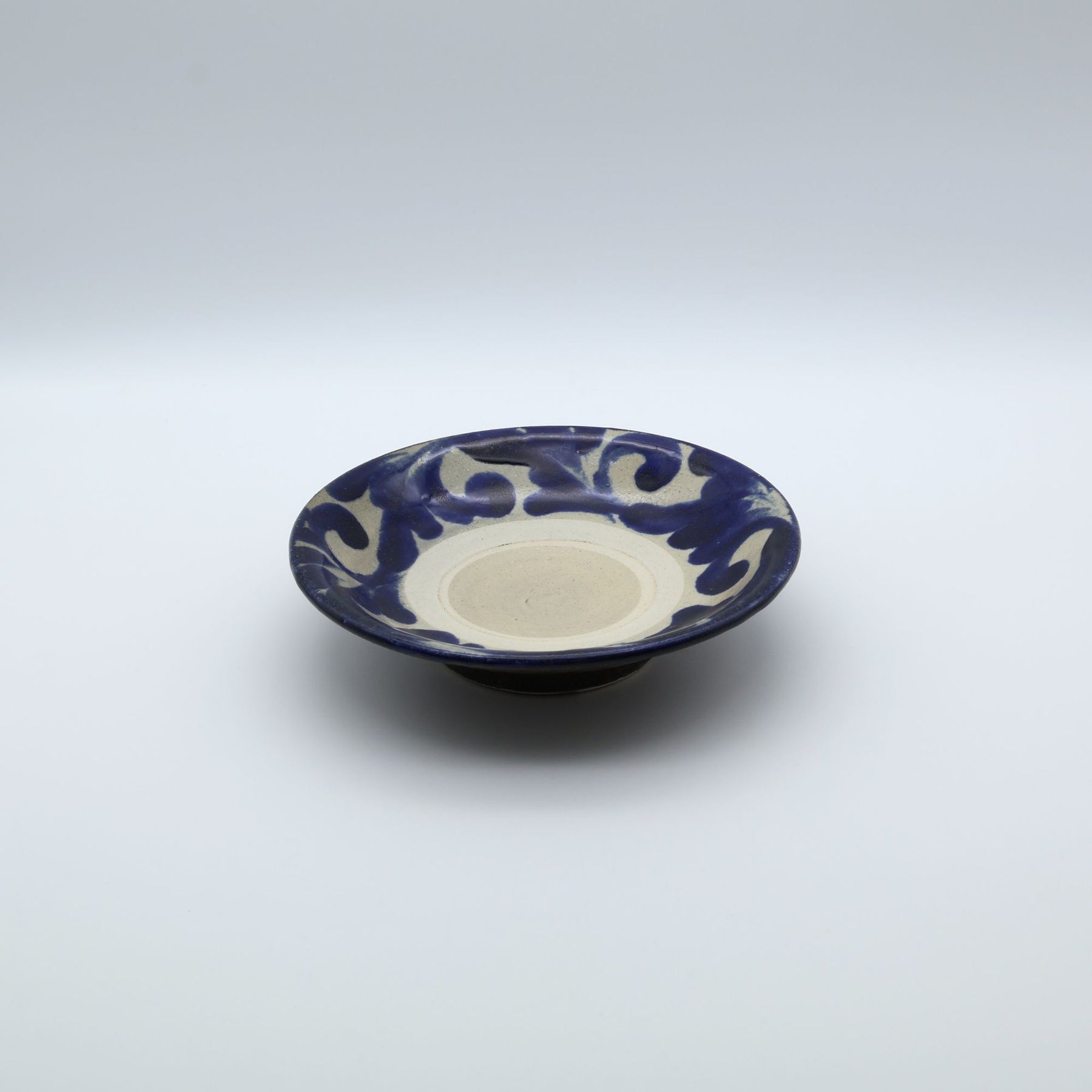 こちらは6寸サイズの中皿で表面に蛇の目があるタイプ。蛇の目とは器を重ねて焼成する際に、器同士がくっつくのを防ぐため、上に積む器の高台が当たる部分の釉薬をあらかじめはぎ取ってできる器中央の白い輪っかのこと。ザラりとした質感で経年変化が楽しめるのも特徴のひとつです。サラダを盛りつけたり、コロッケをのせたり、少し余裕のある取り皿としても重宝します。