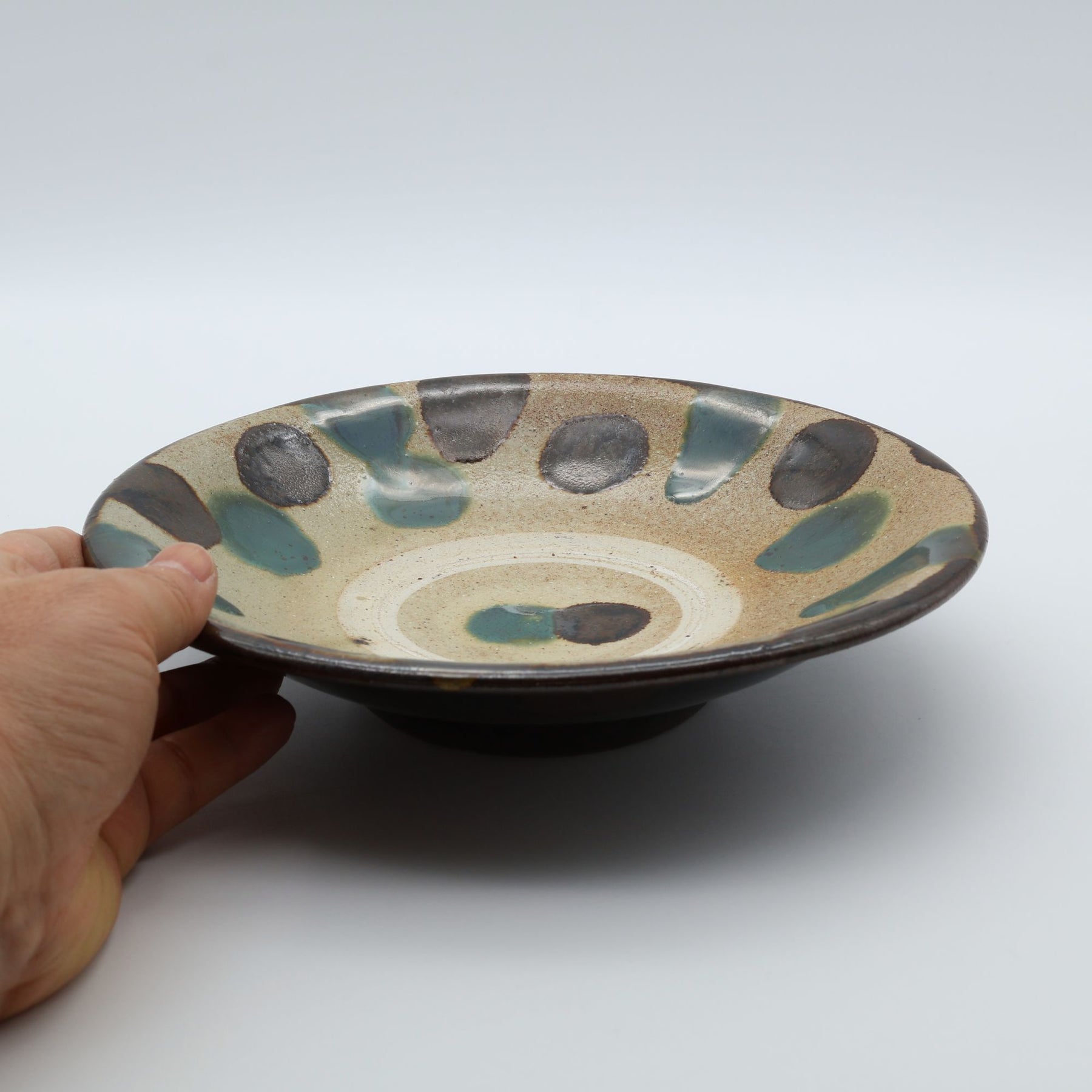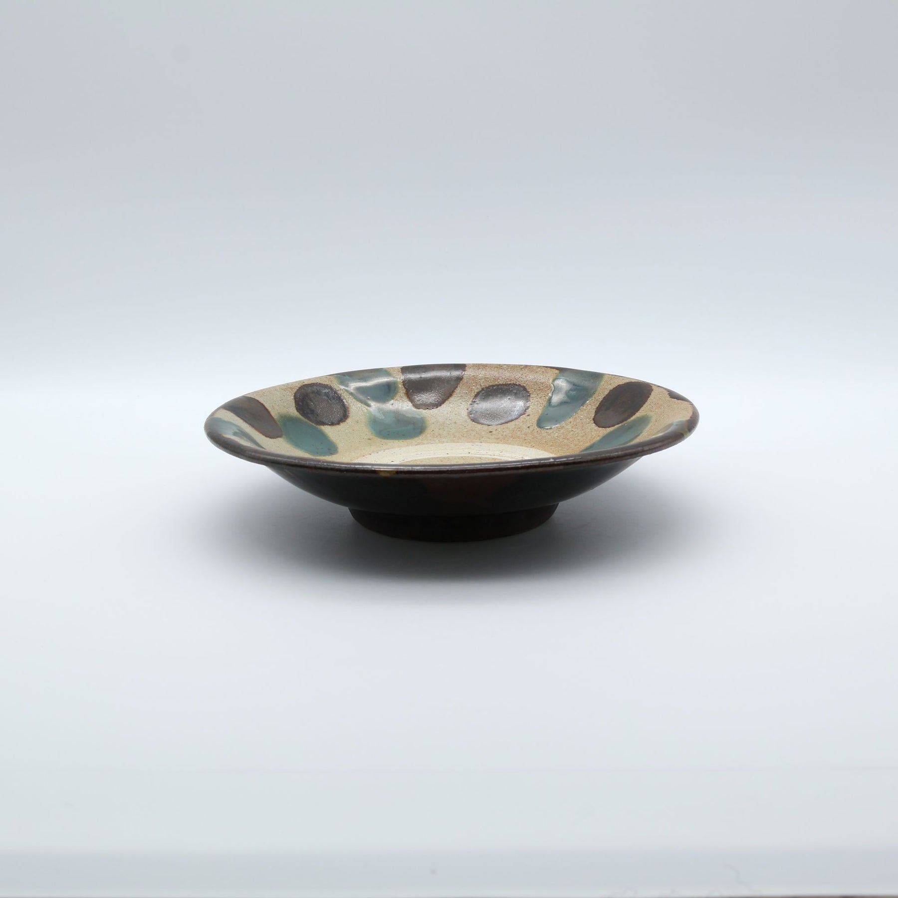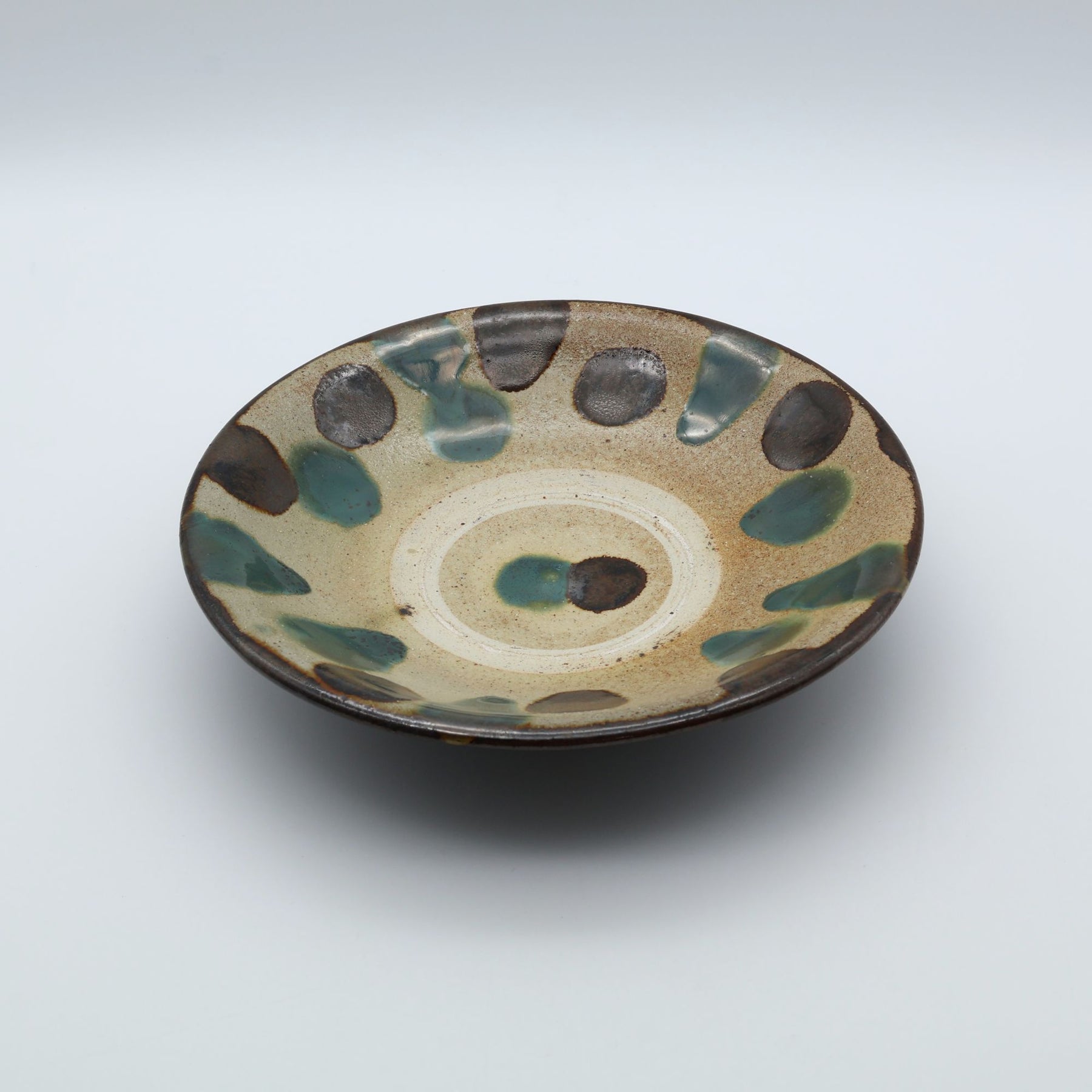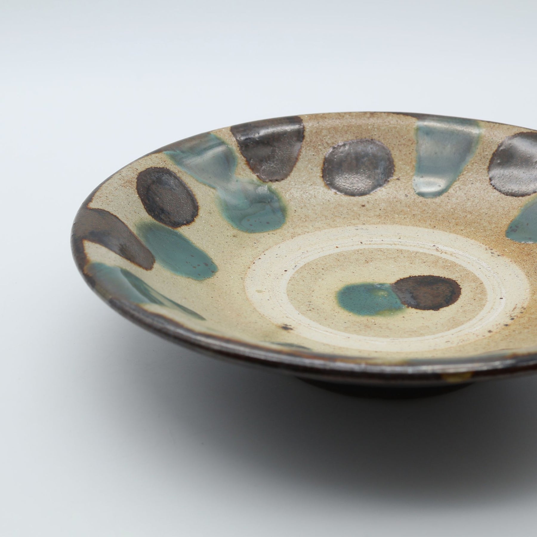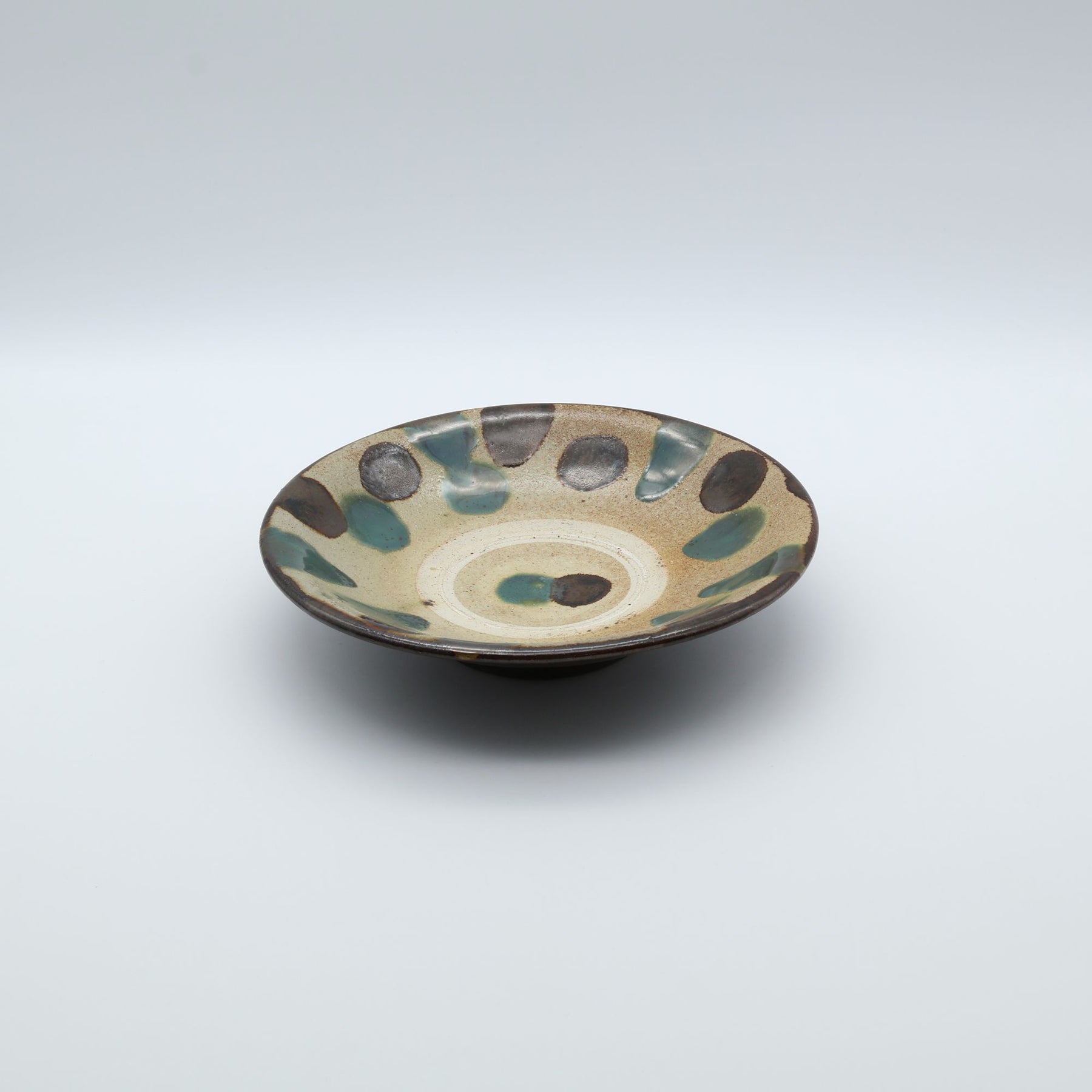 こちらは6寸サイズの中皿で表面に蛇の目があるタイプ。蛇の目とは器を重ねて焼成する際に、器同士がくっつくのを防ぐため、上に積む器の高台が当たる部分の釉薬をあらかじめはぎ取ってできる器中央の白い輪っかのこと。ザラりとした質感で経年変化が楽しめるのも特徴のひとつです。サラダを盛りつけたり、コロッケをのせたり、少し余裕のある取り皿としても重宝します。