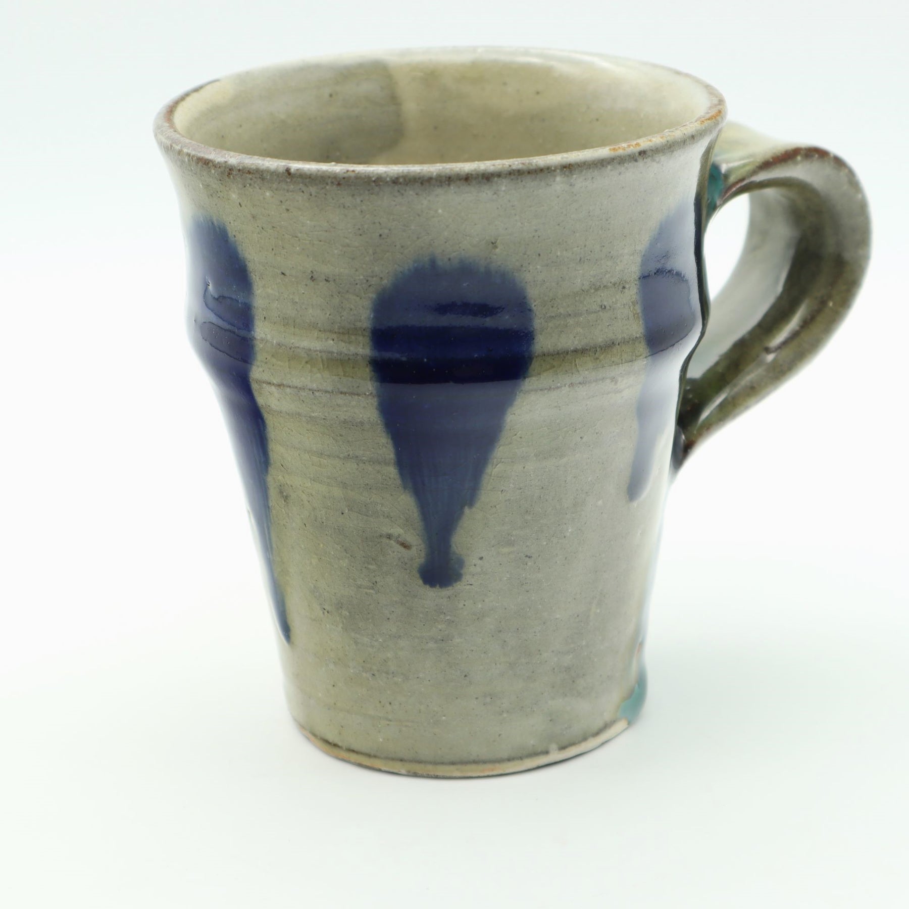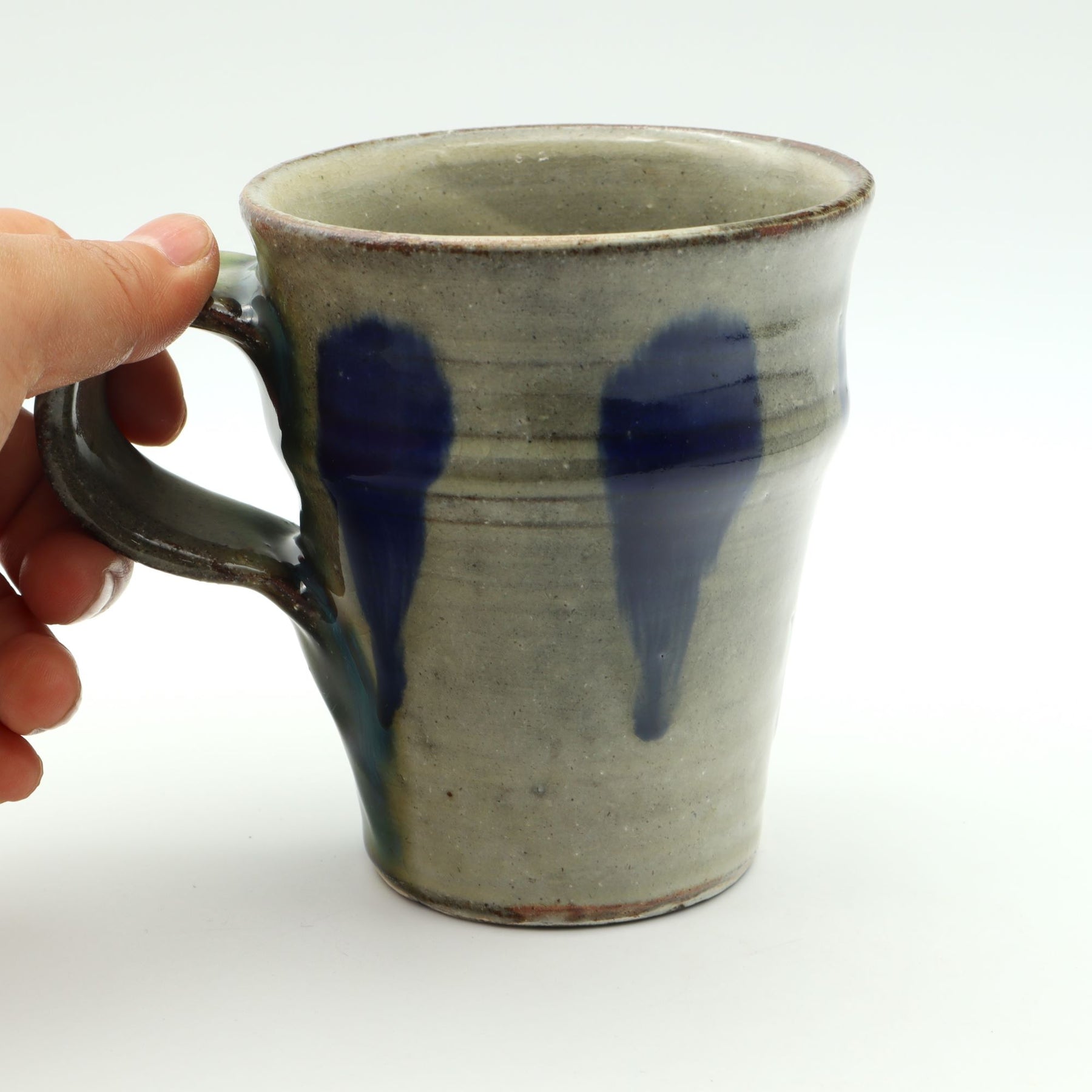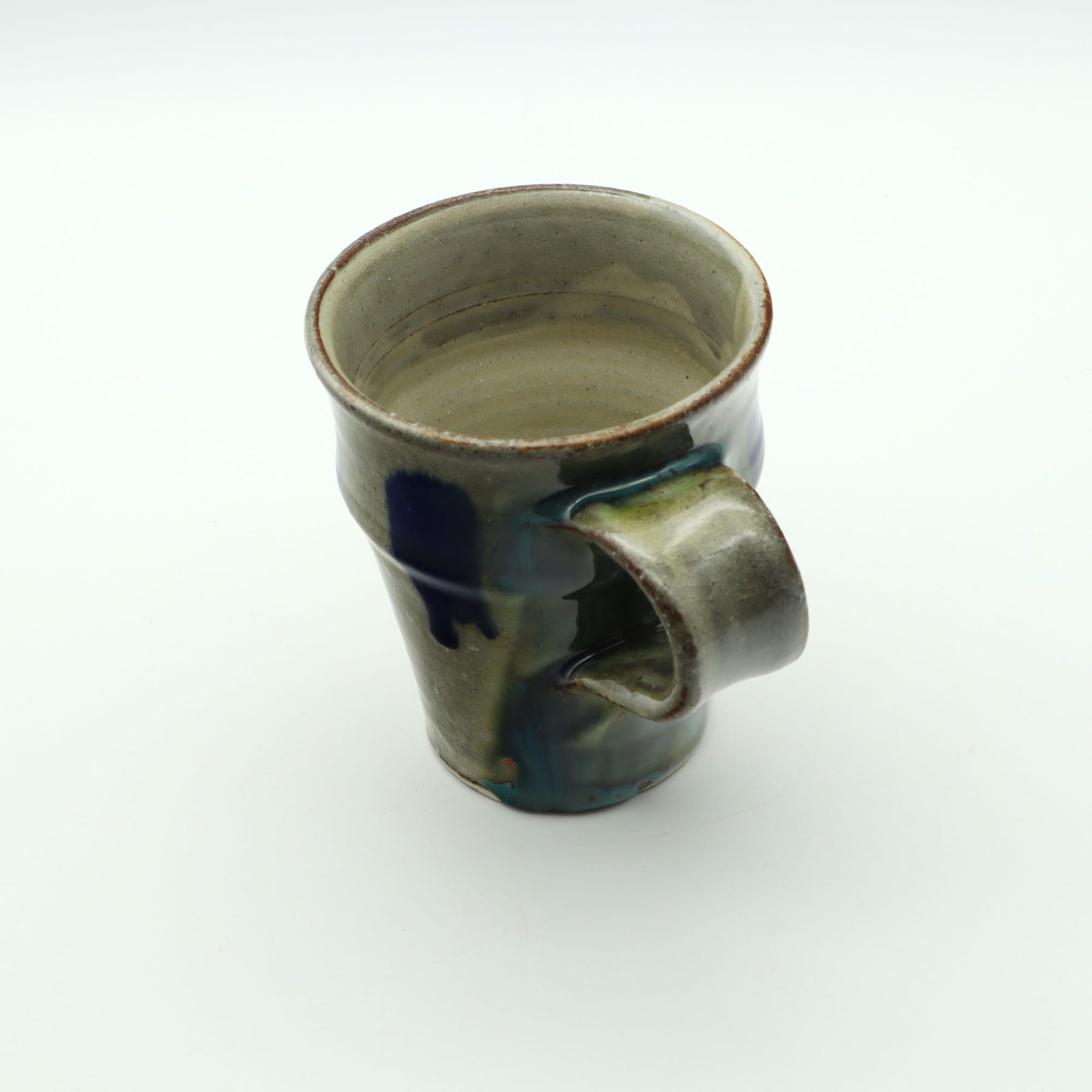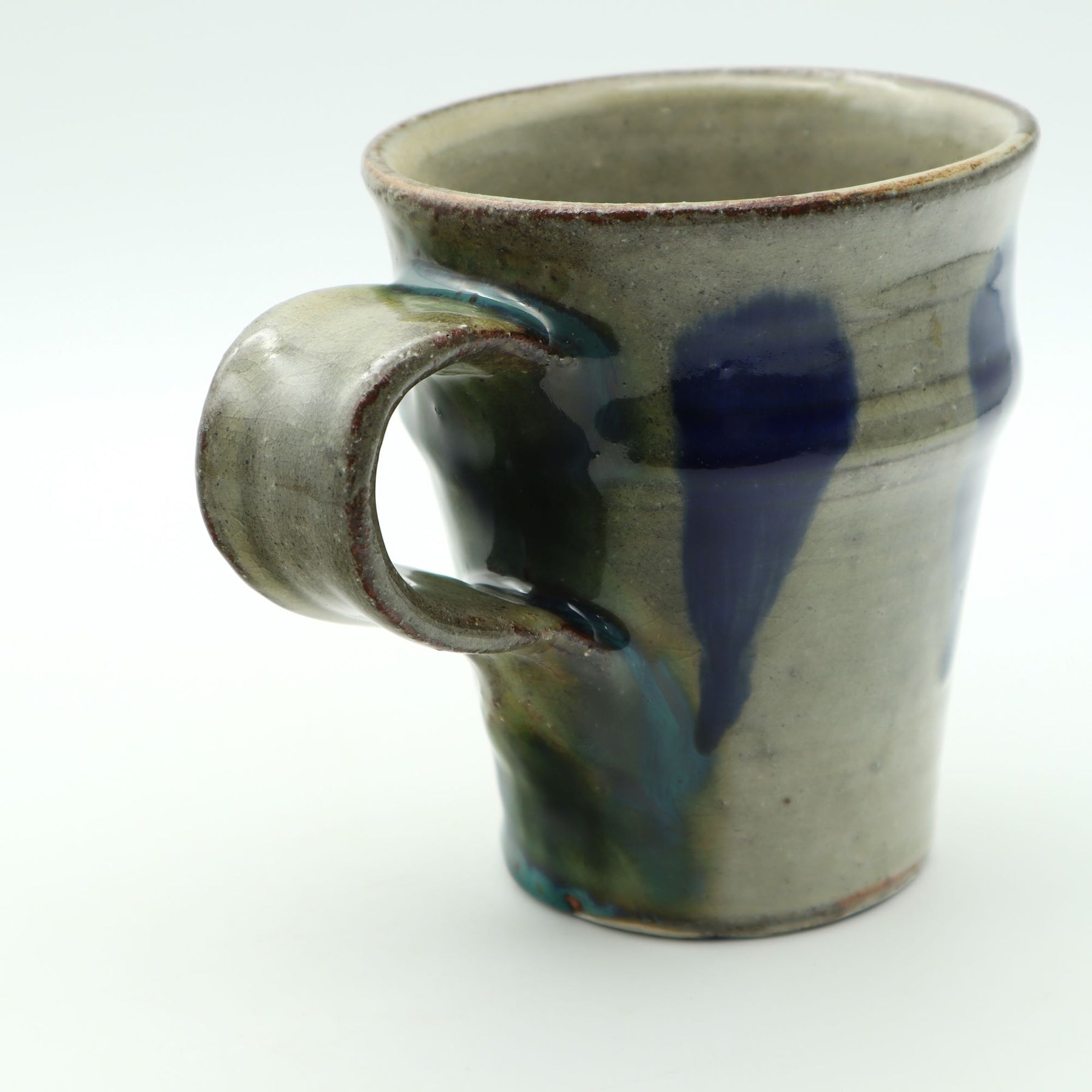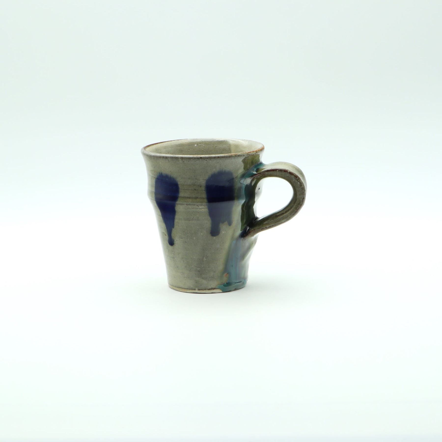 こちらは持ちやすい太めのハンドルが印象的なマグカップ。表面に木の節のような凹凸があり、その上を釉薬が流れてできる模様には同じものは二つとなく、器に個性と奥行きを与えています。自然の風合いが感じられる大らかなマグカップです。