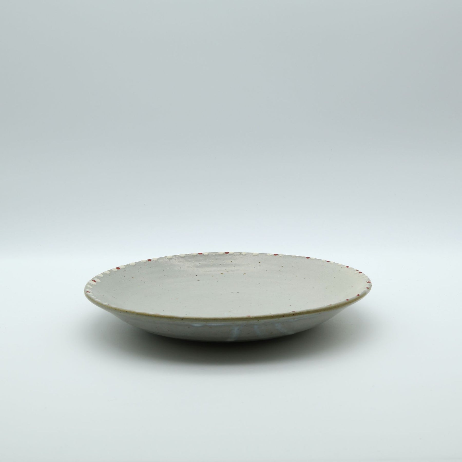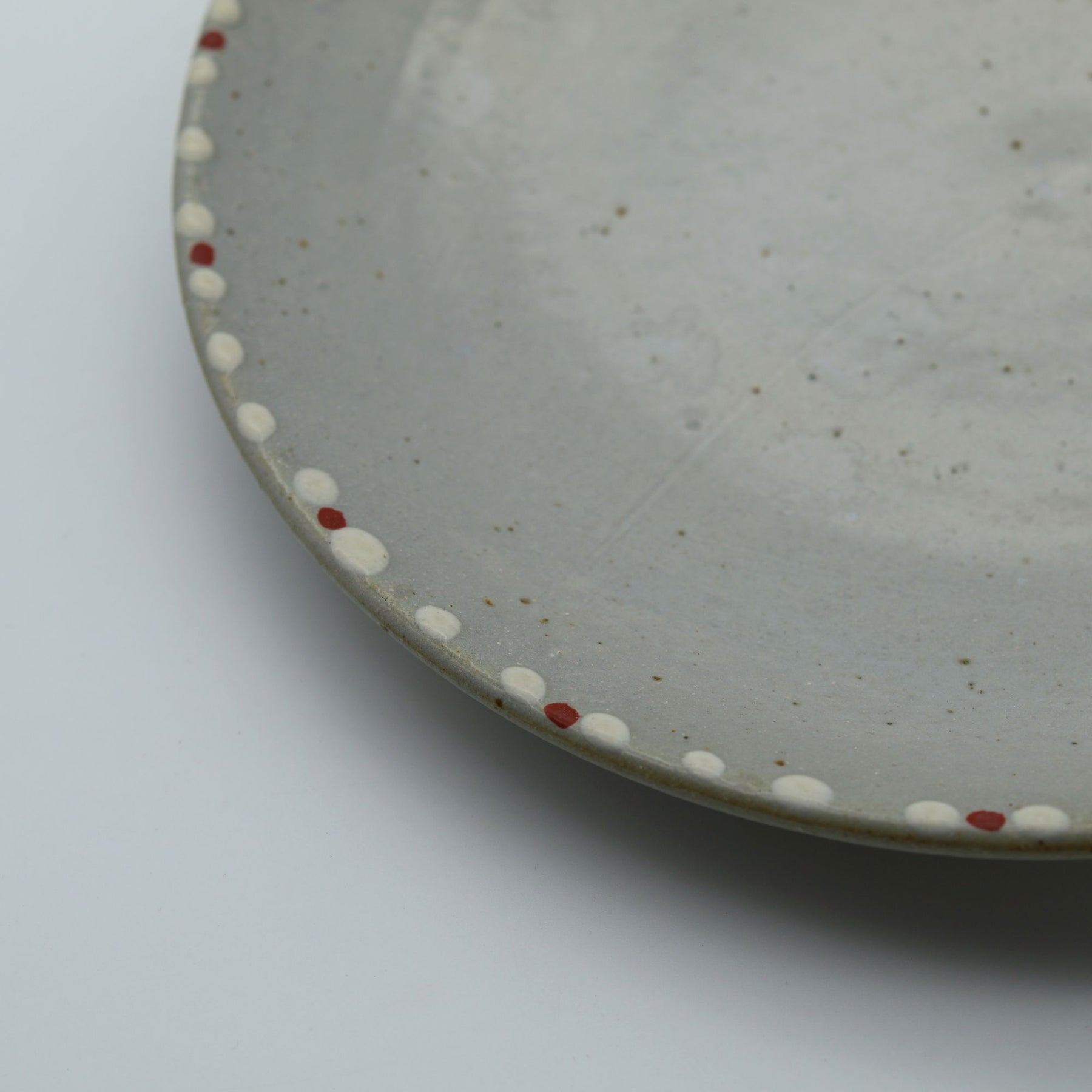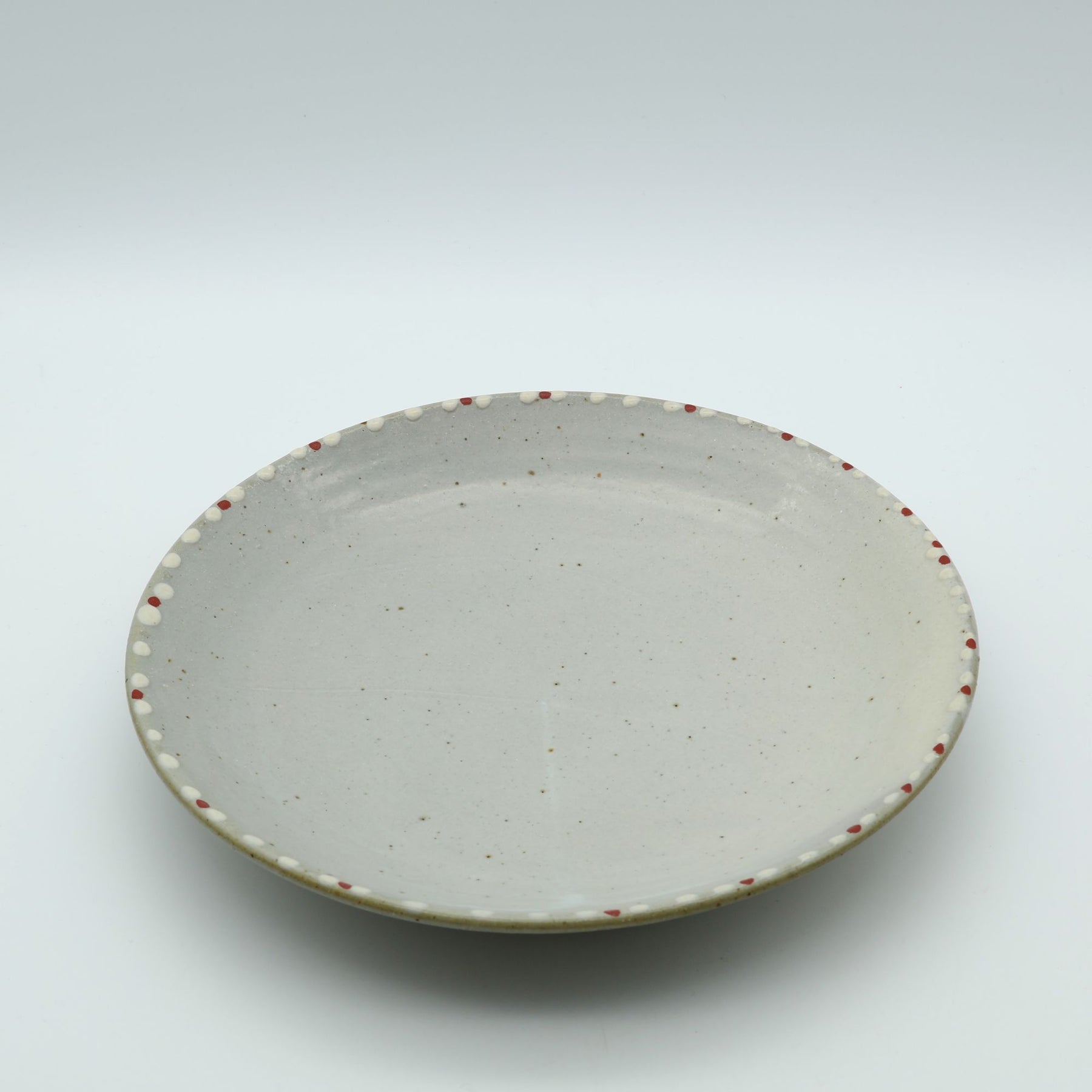こちらは「unity 愛の帯」シリーズの7寸皿。沖縄のサトウキビを釉薬にした器で、人と人を結ぶ愛のリボン、帯を表現したもの。赤と白のドットで表したリボンが帯状にぐるっと一周しており、温かく優しい印象です。ハンバーグや唐揚げ、しょうが焼きなどメインのおかずのほか、炒飯やオムライスなど単品料理にもオススメです。