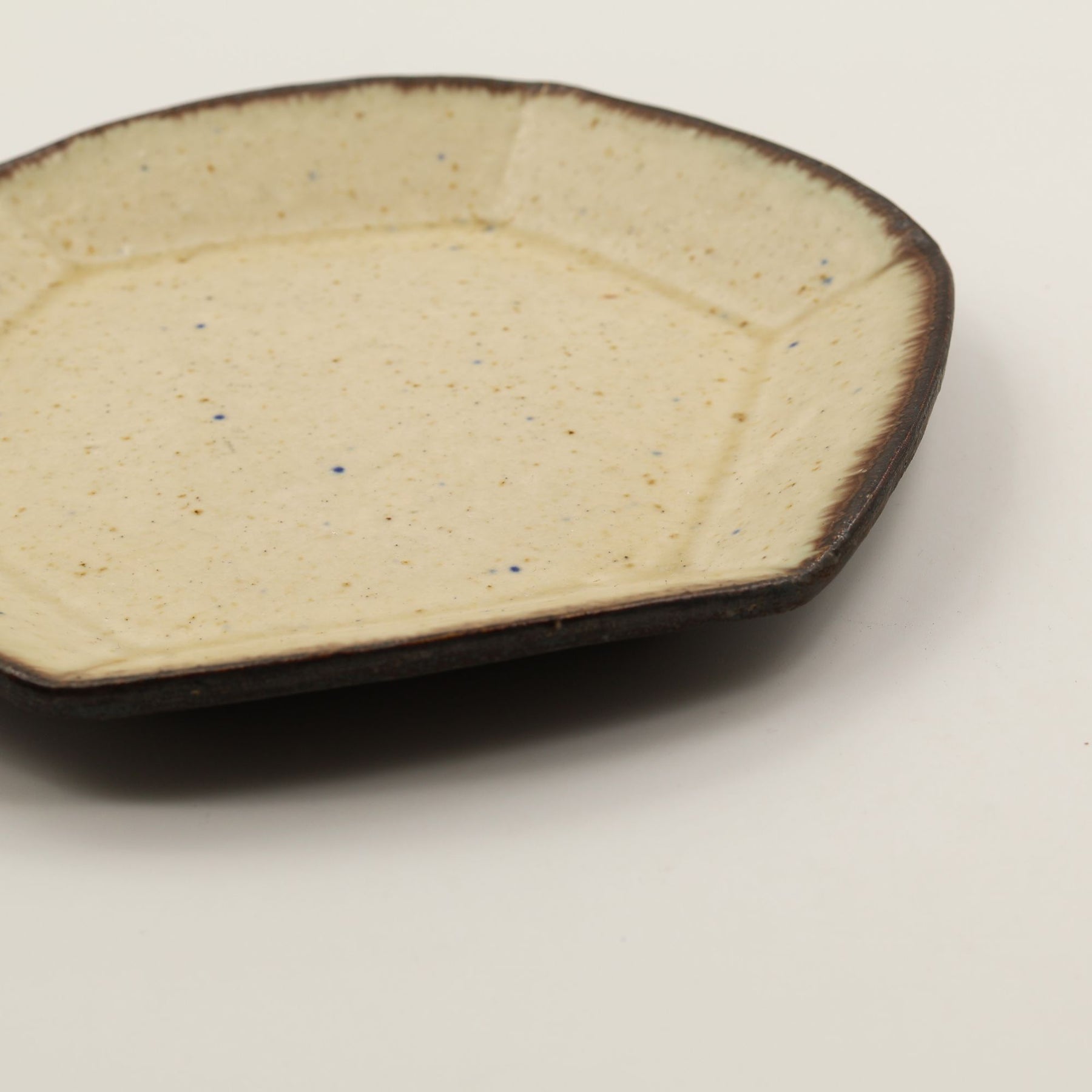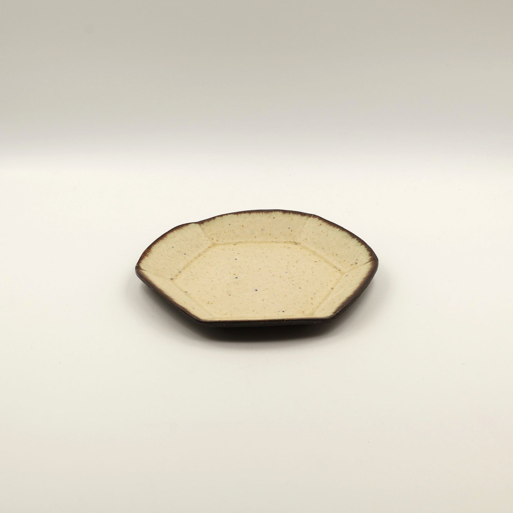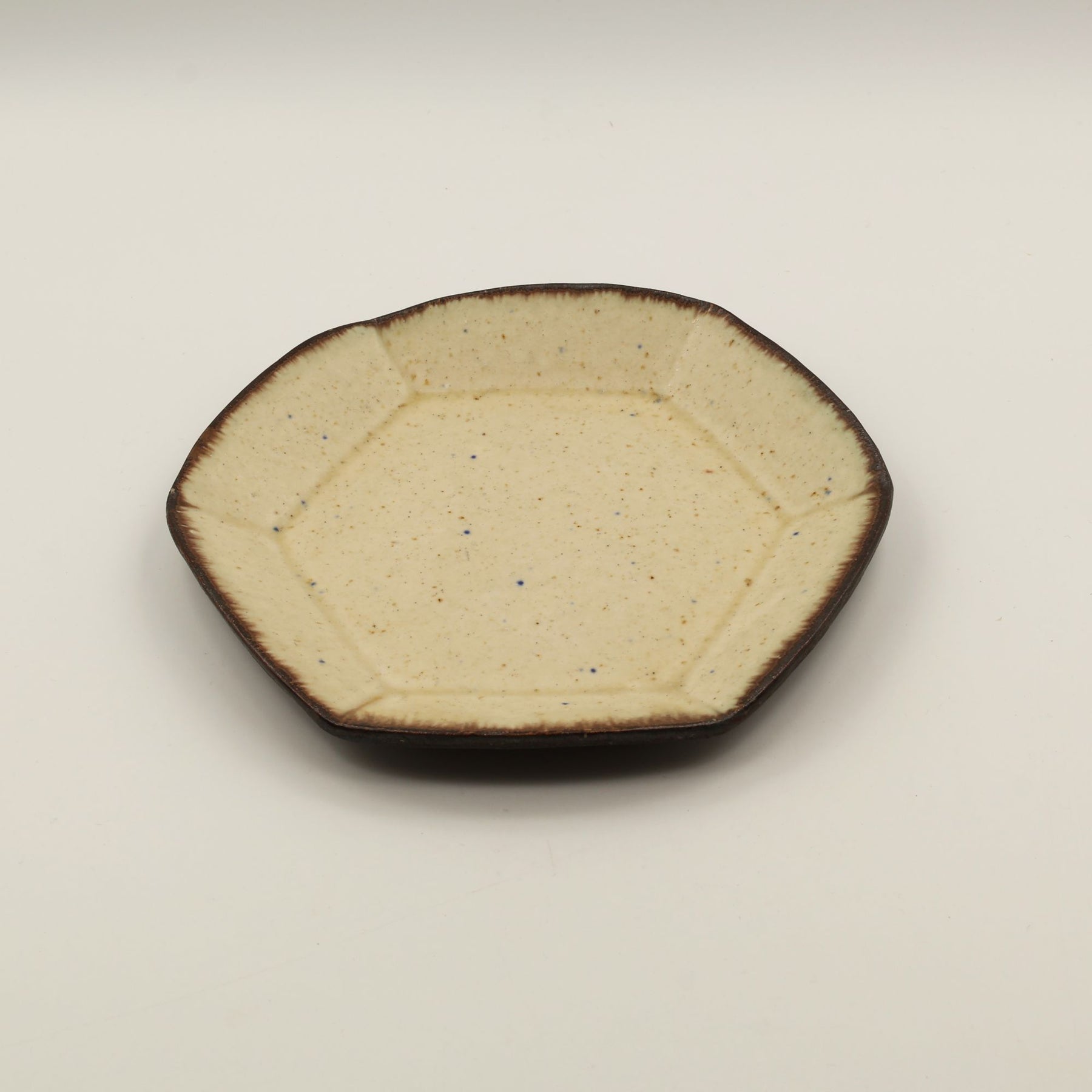 こちらは珍しい六角形のお皿。やわらかなベージュの色合い、散りばめられた青や茶色の小さな斑点、縁にかかる落ち着いたこげ茶の釉薬の濃淡などが手仕事の温かみを感じさせる一枚。やさしく静かな陰影が映え、柔らかな立体感を生み出しています。取り皿やパン皿、ケーキ皿として最適なサイズ感。テーブルに上品な温もりを添えてくれるアイテムです。