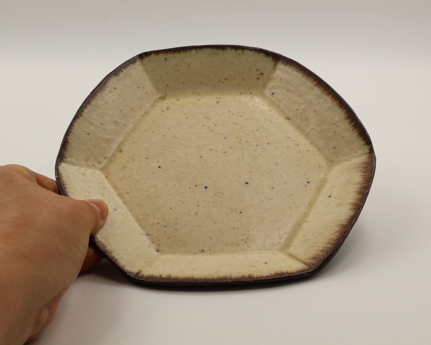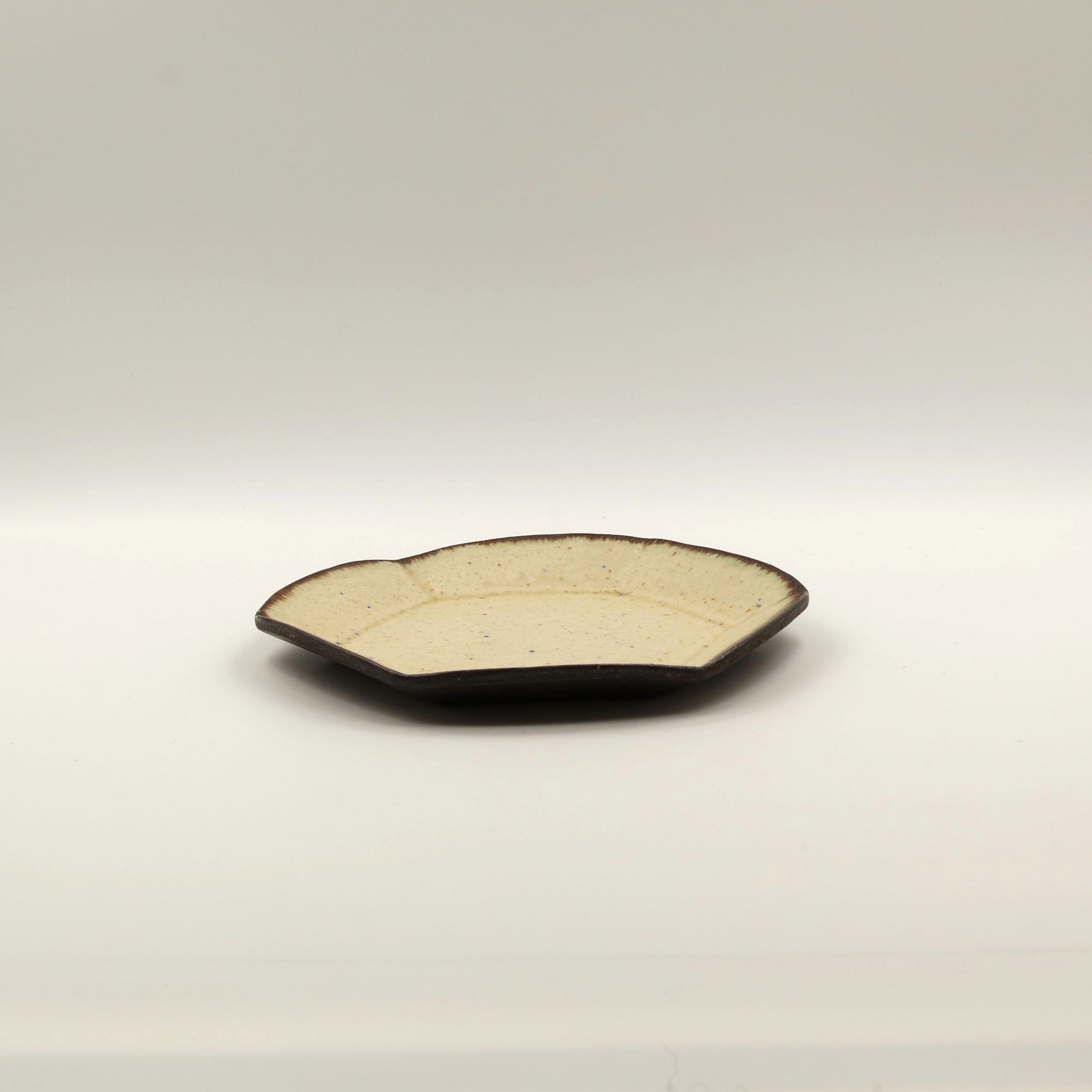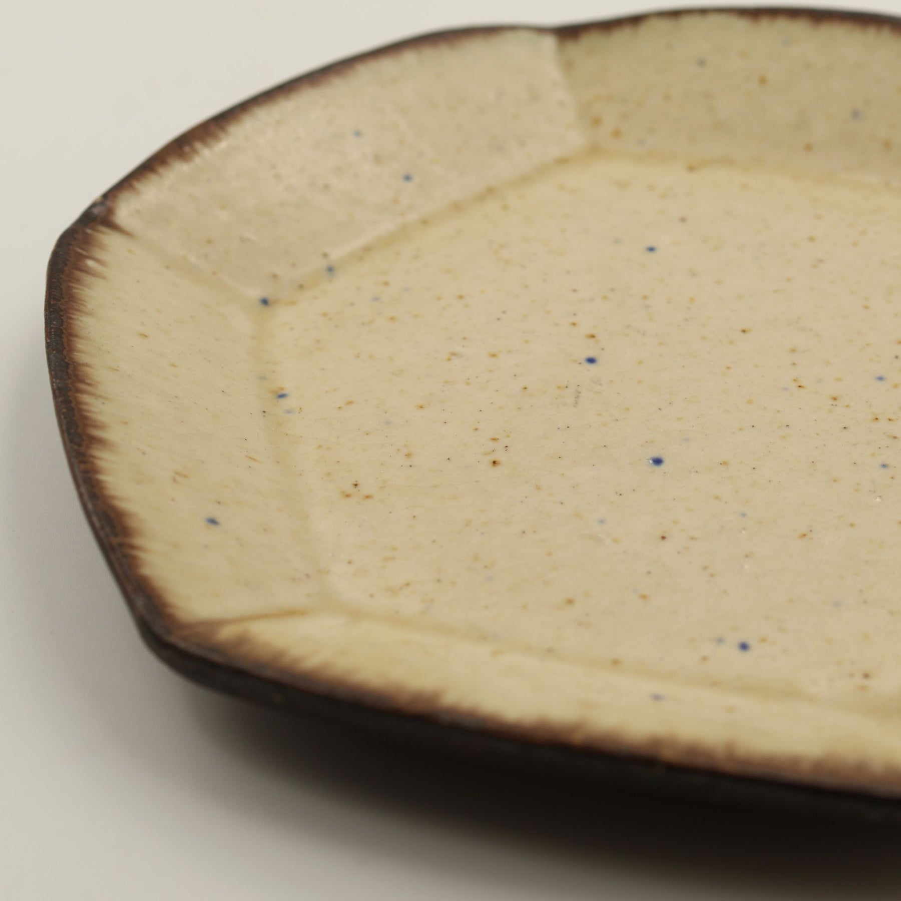 こちらは珍しい六角形のお皿。やわらかなベージュの色合い、散りばめられた青や茶色の小さな斑点、縁にかかる落ち着いたこげ茶の釉薬の濃淡などが手仕事の温かみを感じさせる一枚。やさしく静かな陰影が映え、柔らかな立体感を生み出しています。取り皿やパン皿、ケーキ皿として最適なサイズ感。テーブルに上品な温もりを添えてくれるアイテムです。