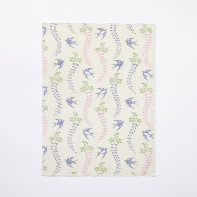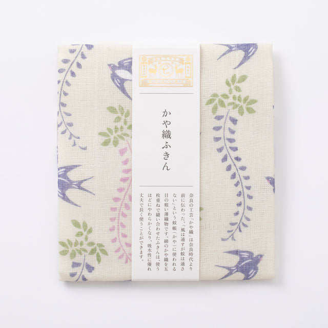 垂れ下がる藤の花と軽やかに飛び回るツバメ。春から初夏に移ろう季節を表した絵柄が描かれたふきんです。