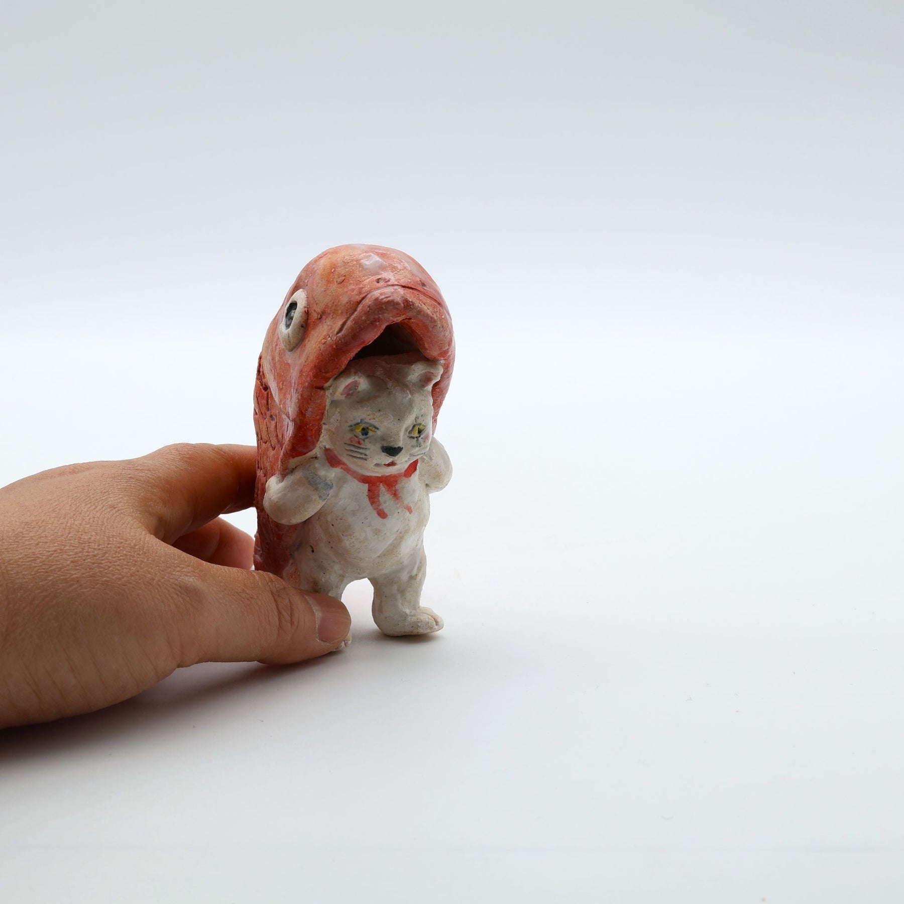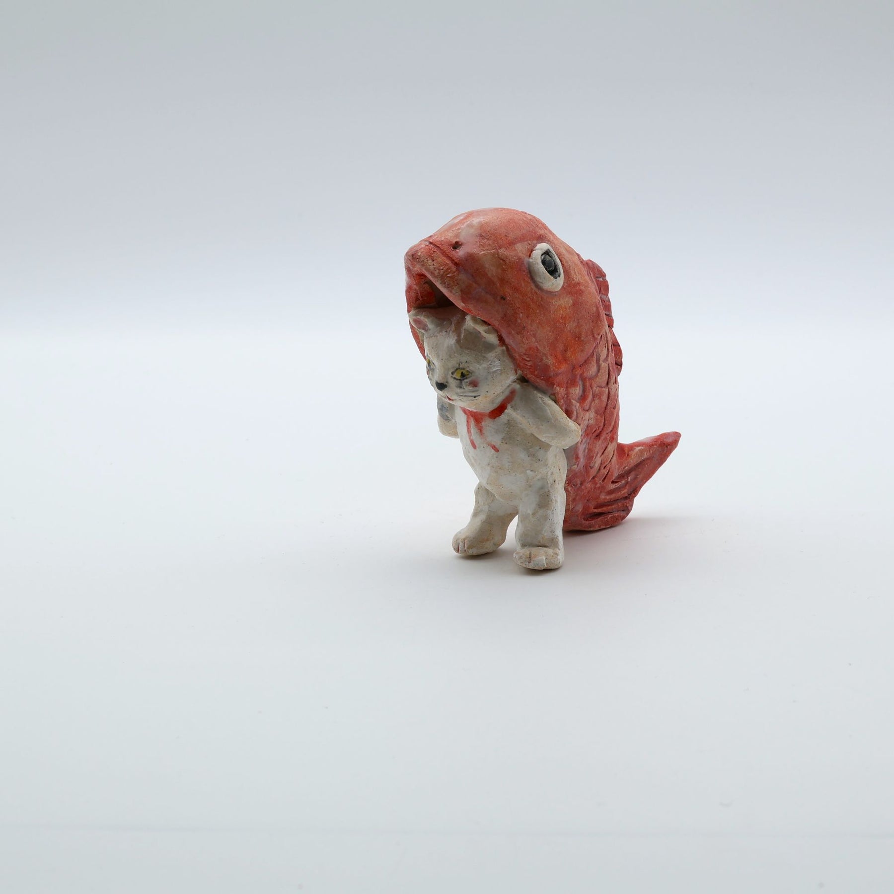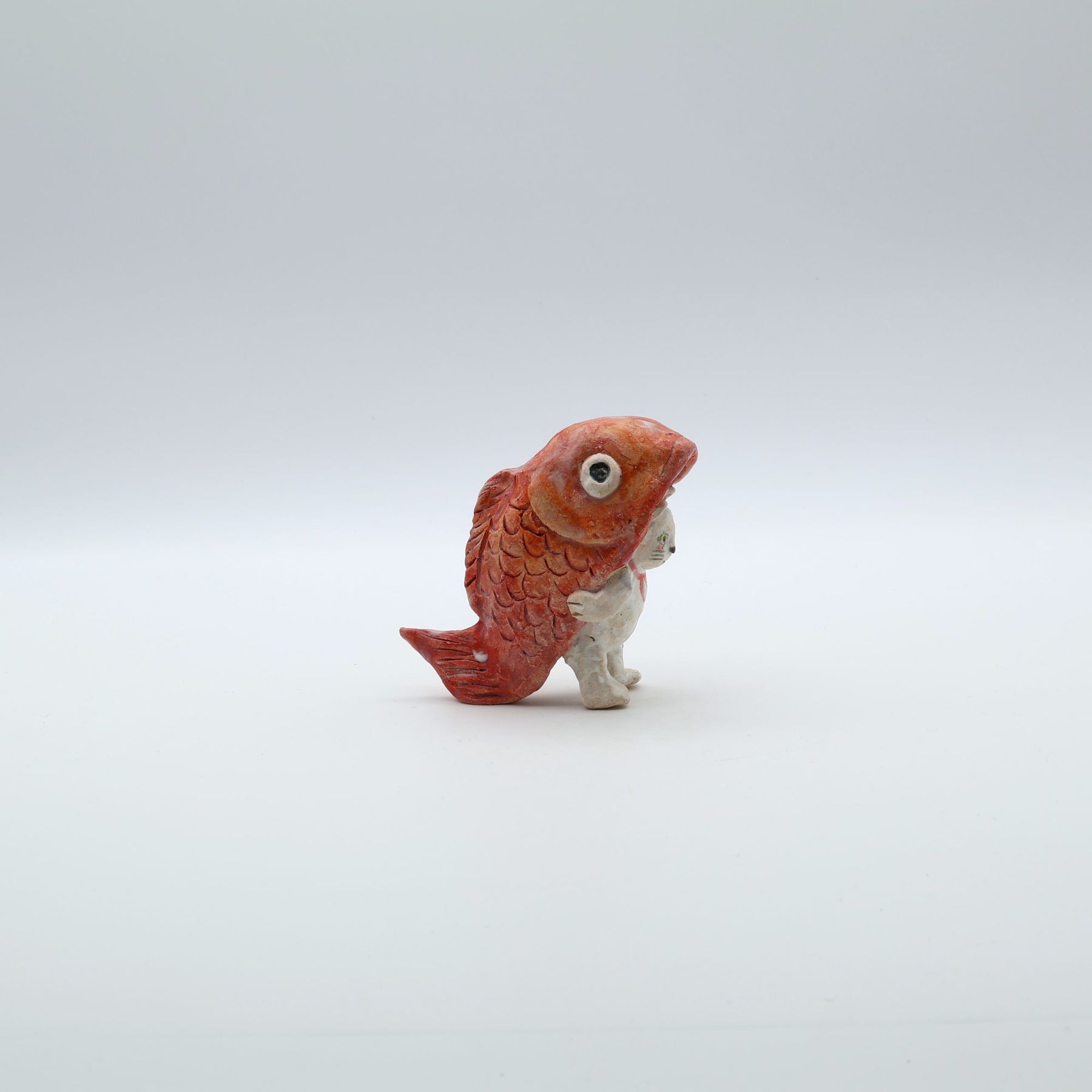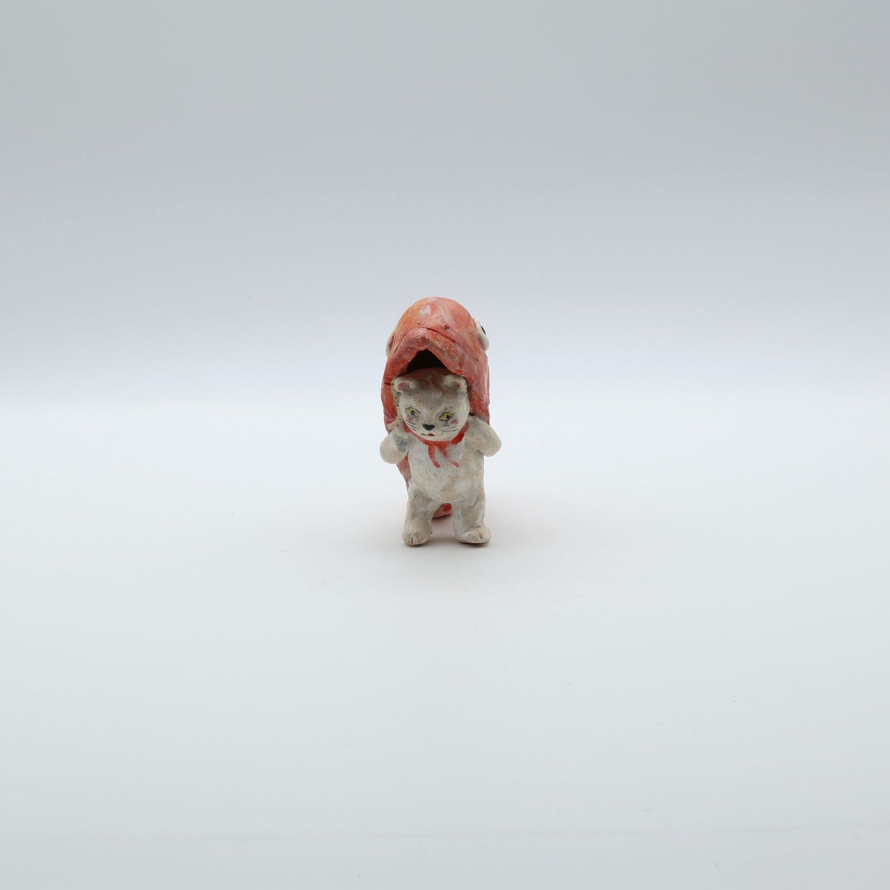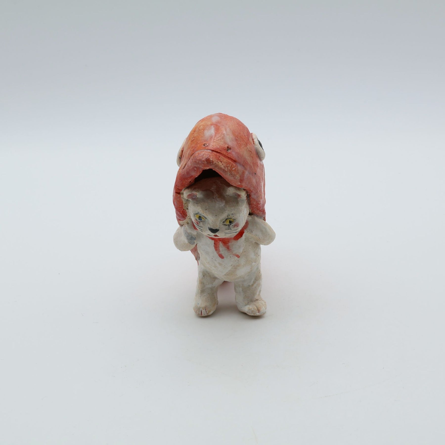 こちらはタイをかぶったねこのオブジェ。おとなしいふりをする意味の「猫を被る」ということわざがありますが、その猫が鯛を被っているこの状態は何を意味するのでしょうか。「めでたい」に通じる縁起物の魚にあやかりたいのかもしれません。新しいことわざが生まれそうな予感です。